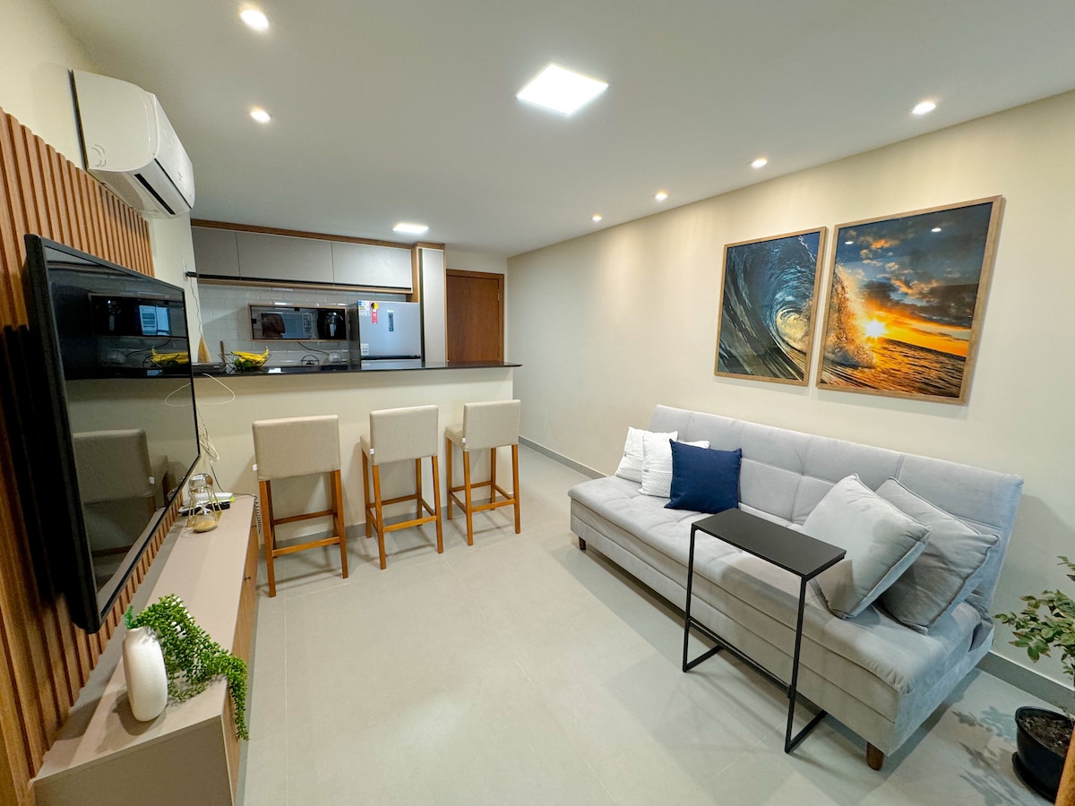 Ímyndaðu þér að opna dyrnar og vera undrandi á rými sem er fullt af þægindum og stíl. Þetta er þessi 2 svefnherbergja íbúð (önnur þeirra svíta); algjör gimsteinn og til reiðu fyrir allt að 6 manns á þægilegan og notalegan hátt. Ef þú ert að leita að eign með andliti og heimili var að finna! Og það besta: á stefnumarkandi stað í borginni, í hinu göfuga Enseada do Suá, þaðan sem þú hefur greiðan aðgang að helstu ferðamannastöðum Vitória og Vila Velha.