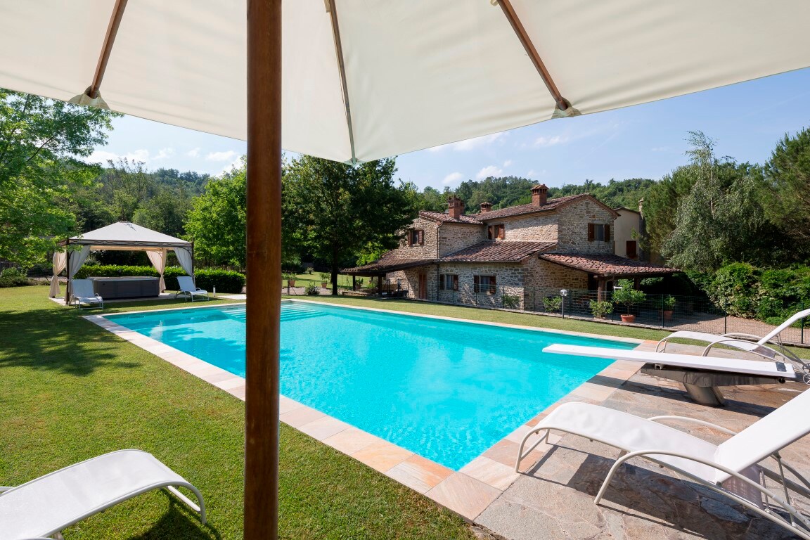 Villa Pianelli er hefðbundið bóndabýli frá 1500 og samanstendur af tveimur byggingum. Aðalhúsið þar sem ég bý, alltaf til taks svo að dvölin gangi örugglega snurðulaust fyrir sig og íbúðin í garðinum. Hvort tveggja er algjörlega sjálfstætt með aðskildum inngangi. Íbúðin í garðinum samanstendur af 5 herbergjum á jarðhæð, innréttingarnar hafa haldið einkennum Toskana með múrsteinslofti, kastaníubjálkum og terrakotta-gólfum. Það eru 2 tvíbreið svefnherbergi, 1 baðherbergi með sturtu, 1 setustofa með viðarinnréttingu og opið eldhús - borðstofa. Eldhúsið er með ísskáp,ofni og keramikhelluborði. Frá setustofunni er hægt að komast í heilsulindina með sánu og þaðan út í garð með verönd og b.b.q. Sundlaugin er 8mx16m og er opin frá maí til september, búin sólbekkjum, b.b.q svæði og stórri yfirbyggðri pergola með borðstofuborðum og stólum. Villa Pianelli er afskekkt í rólegu horni sveitarinnar í Toskana, staðsett í hæðum Arezzo, umkringt vínekrum, ólífulundum og eikarskógum. Við getum boðið gestum okkar upp á kyrrð og ró um leið og við tryggjum ýmsa möguleika á afþreyingu í víngerðum, veitingastöðum,verslunum o.s.frv. í nokkurra kílómetra fjarlægð í Arezzo. Vinsamlegast hafðu í huga að í húsinu eru tvö svefnherbergi en ef bókunin er fyrir tvo einstaklinga verður aðeins boðið upp á eitt svefnherbergi. Ef þess er krafist er viðbótarkostnaður 50 evrur á nótt fyrir annað svefnherbergið.