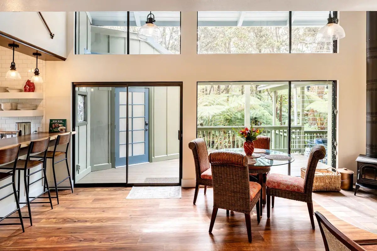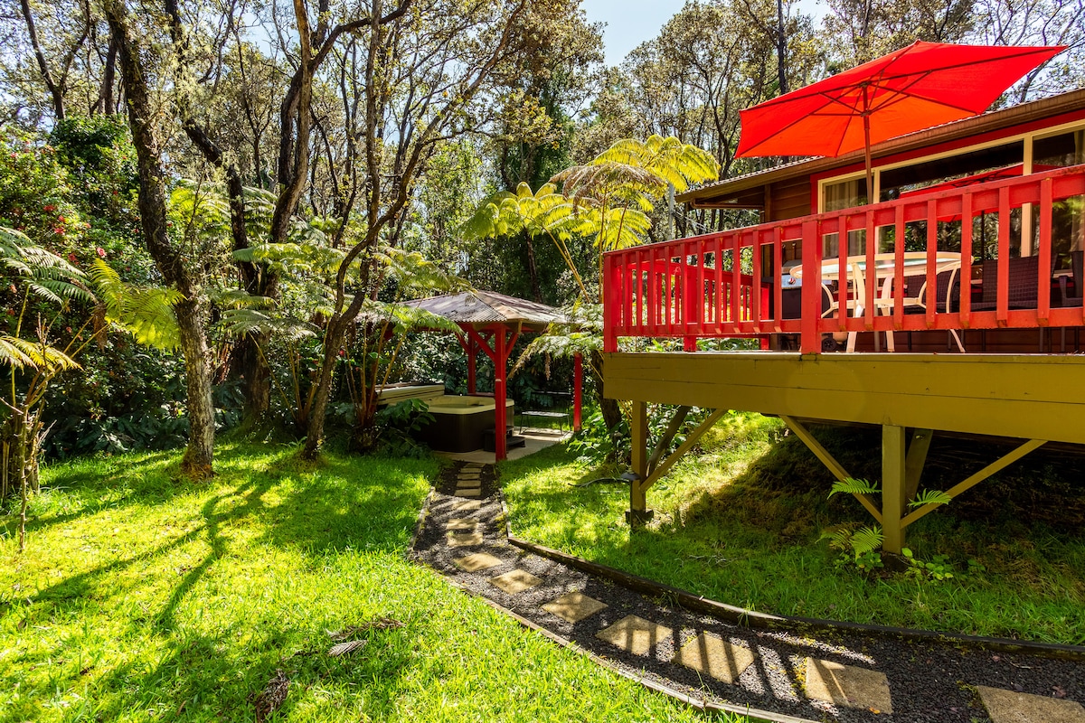 Í skógi vaxnum hlíðum Kīlauea eldfjallsins er sedrus-kofi með útsýni yfir upprunalegan regnskóginn 1,4 mílur (2,2 km) frá Nāhuku (hrafntinnu) í Hawaiʻi Volcanoes þjóðgarðinum. Með þessum svefnaðstöðu getur maður komist í návist við umhverfið, tekið þátt í ævintýrum um eyjuna og haft það notalegt í framhaldinu. Meðal samferðamanna þinna eru af og til tunglsljósið í mistrinu, gljáandi Milky Way og friðsæl morgunbirta sem melódískir fuglar píla um lanai.