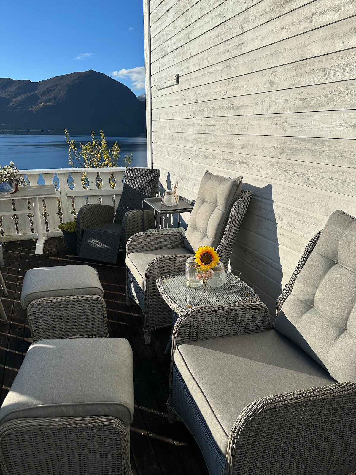 Íbúð með stórri verönd og útsýni yfir fjörðinn.
