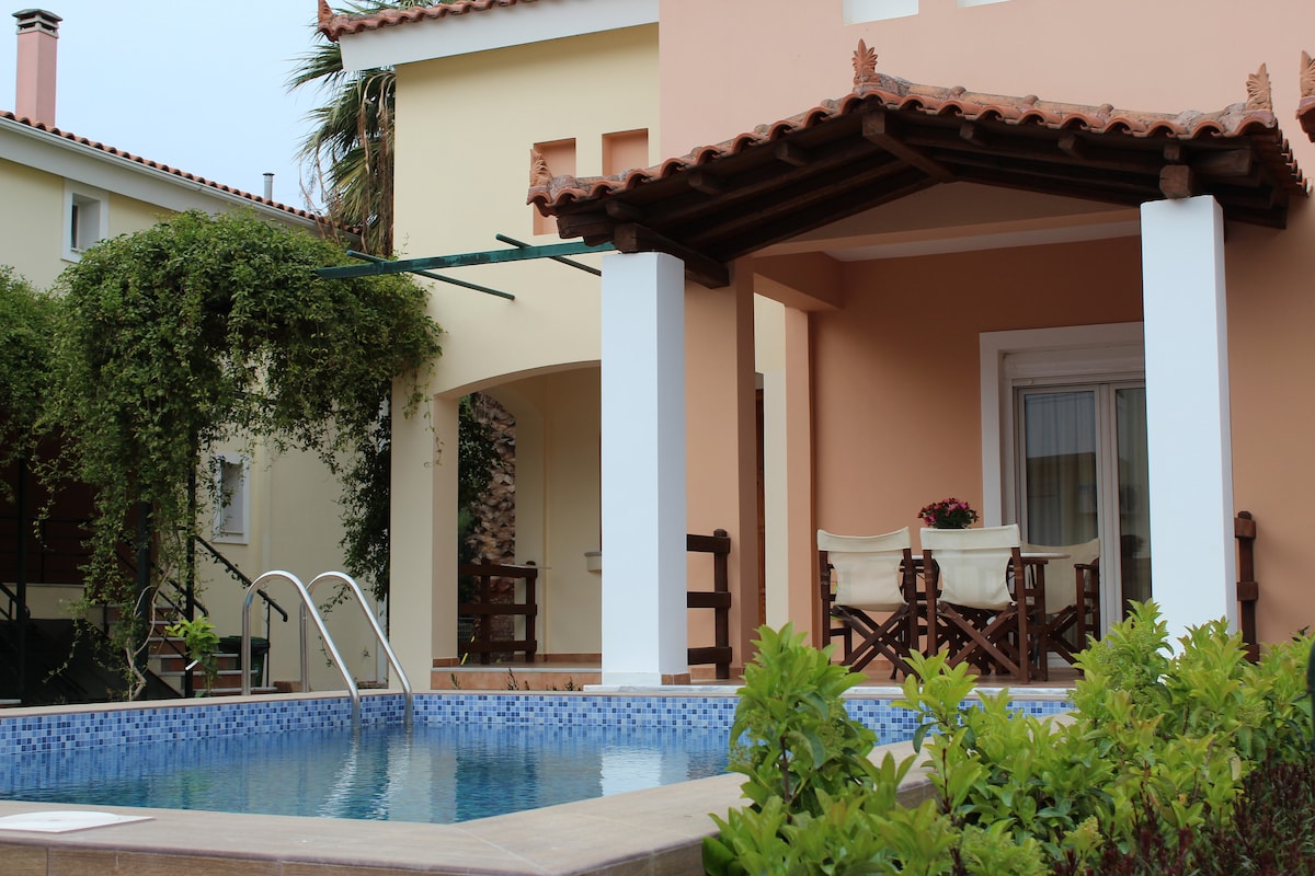 Rúmgott heimili á tveimur hæðum með frábæru útsýni, stórum fallegum garði á rólegum stað við hliðina á appelsínutrjám nálægt sjónum. Tilvalið fyrir fjölskyldu með börn. Nálægt eru matvöruverslanir, kaffihús, barir, bakarí, apótek og allt sem þarf til að eiga ánægjulega dvöl. Það er strönd með bláum fána í aðeins sex mínútna göngufjarlægð. Aðeins 1 klukkustund frá alþjóðaflugvellinum í Aþenu, er tilvalið til að skoða fornu Kórintu, Epidaurus, Olympia, Nafplio, Mycenae, Korinthia.