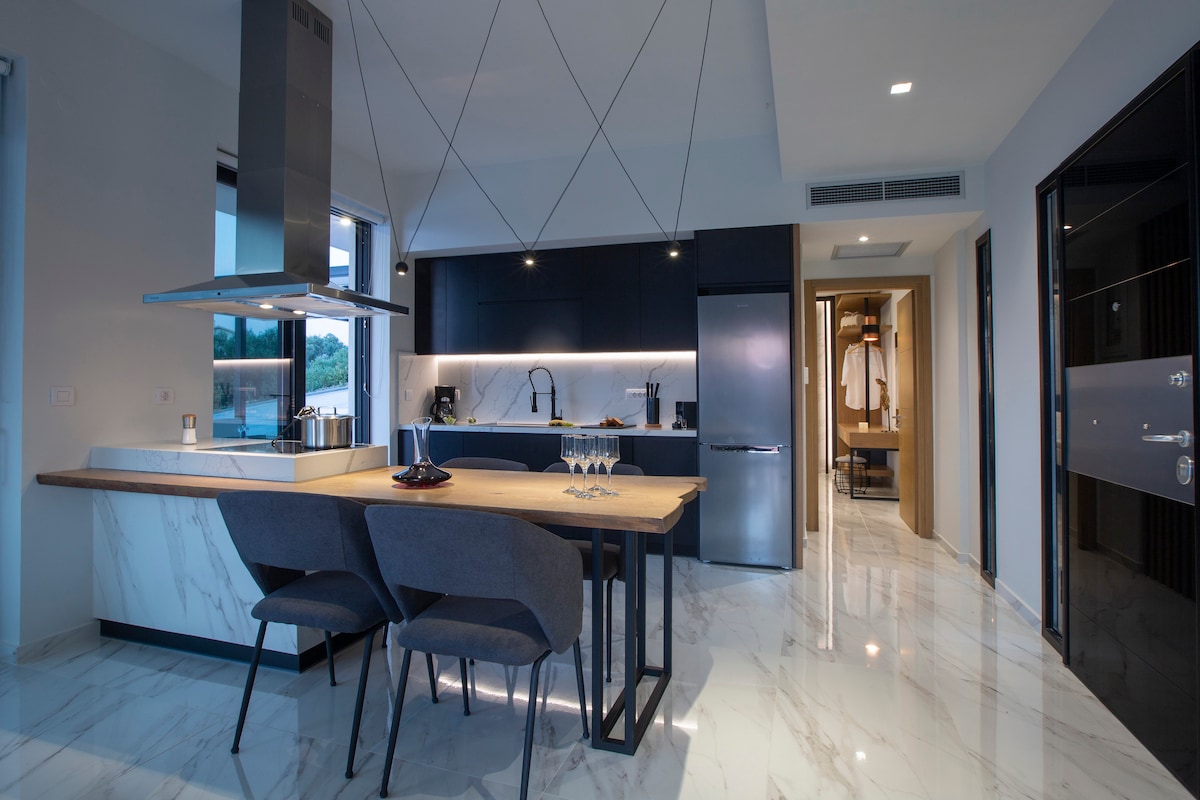 Dekraðu við þig og veisluna þína í fríið sem þú átt skilið! Gistu í þessari glænýju nútímalegu villu með ótrúlegu sjávarútsýni aðeins 200 metra frá langri sandströnd. Villa Ouranos er dreift út á 3 stigum. Það er með 3 svefnherbergi, öll með ensuite sturtuherbergjum og auka wc, fullbúnu eldhúsi, setustofu og borðstofu með óviðjafnanlegu sjávarútsýni. Úti er með stóra sundlaug (4m x 9m) með nuddpotti, borðkrók með innbyggðu bbq, sólbekkjum, einkabílastæði. Alveg a/c, wifi.
