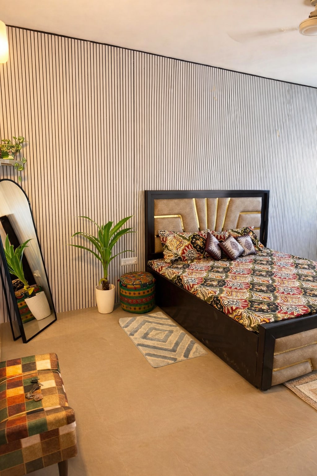 Verið velkomin í Kalyani Kutir, lúxusstúdíóíbúð þar sem hefðbundin hlýja mætir nútímaþægindum. Eignin okkar er hönnuð fyrir ferðalanga og býður upp á meira en bara svefnstað. Hún býður upp á upplifun. Stígðu inn í fallega skreyttan og notalegan griðastað fullan af friðsælu andrúmslofti og andlega auðgandi (Krishna-meðvituðu) umhverfi. Vaknaðu á ógleymanlegum morgnum og sötraðu chai í mjúkri birtu. Komdu, aftengdu þig frá hávaðanum og upplifðu sanna kyrrð. Radhe Radhe!