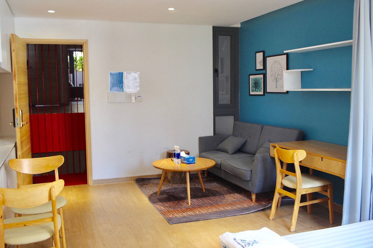Nútímaleg og vel búin stúdíóíbúð í nokkurra mínútna göngufjarlægð frá Back Beach (Bai Sau). Í göngufæri frá Lotte Mart, apótekinu, hverfismarkaði og matvöruverslun. Íbúðin hentar fullkomlega fyrir 4ra manna fjölskyldu með einu svefnherbergi með aukarúmi, eldhúsi, risastórri stofu, þægilegri sturtu, ísskáp, borðstofuborði, vinnuborði, skáp og risastóru þráðlausu neti með You YouTube.