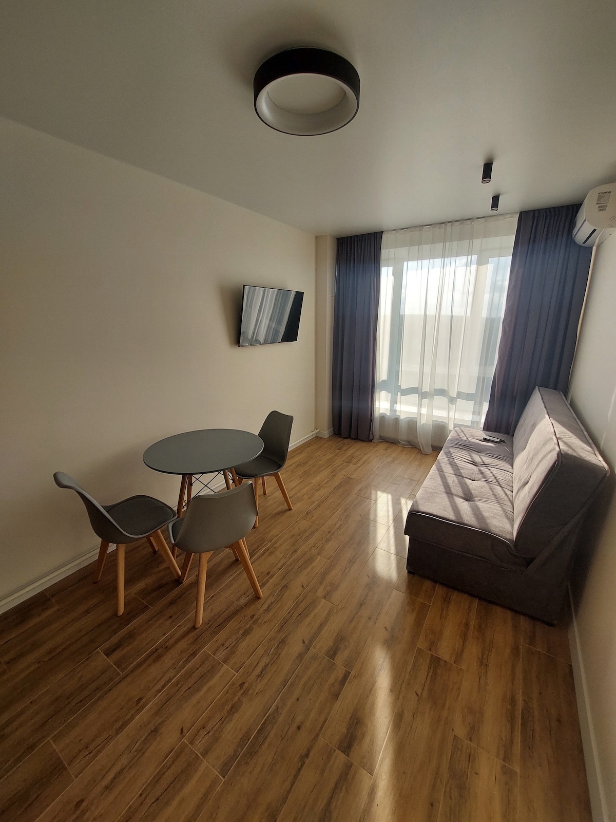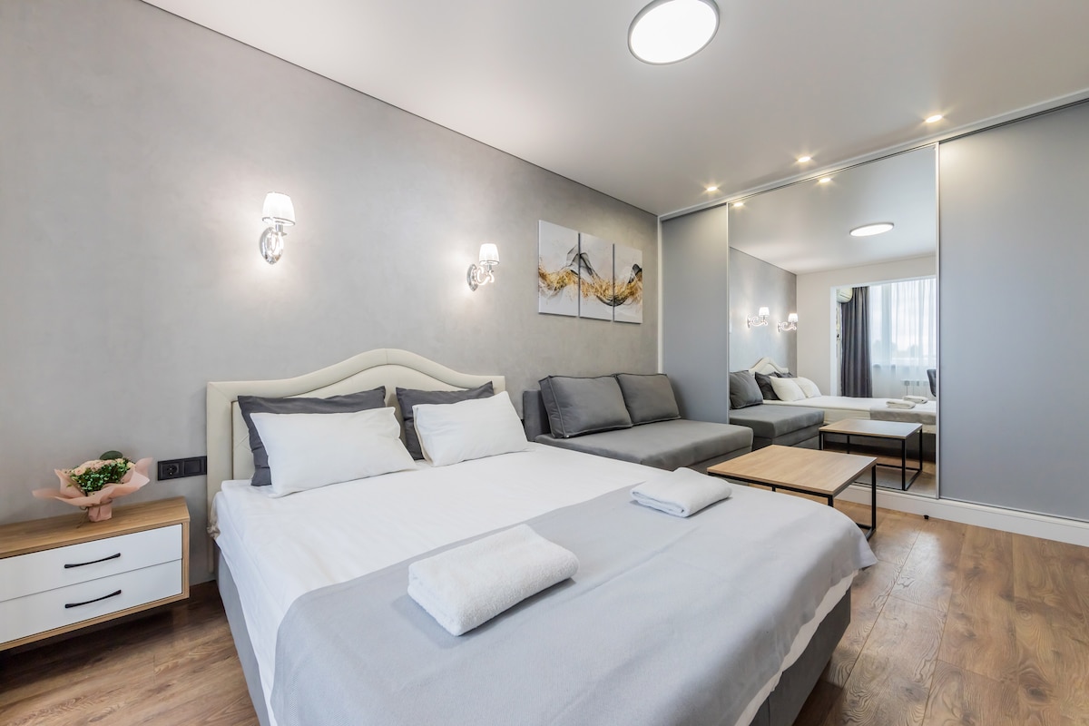 Bjart og nútímalegt stúdíó sem er 35 fermetrar að stærð og er staðsett á rólegu svæði í borginni í göngufæri frá samgöngumiðstöðvum. Rúmgóða herbergið sameinar setusvæði með þægilegum sófa, vel búið eldhús með nútímalegum tækjum, þar á meðal ísskáp, helluborði og örbylgjuofni. Baðherbergið með sturtuklefa er gert í nútímalegum stíl. Í íbúðinni er þráðlaust net, sjónvarp og loftkæling fyrir þægilega dvöl. Kaffihús, verslanir og almenningsgarðar eru í göngufæri.