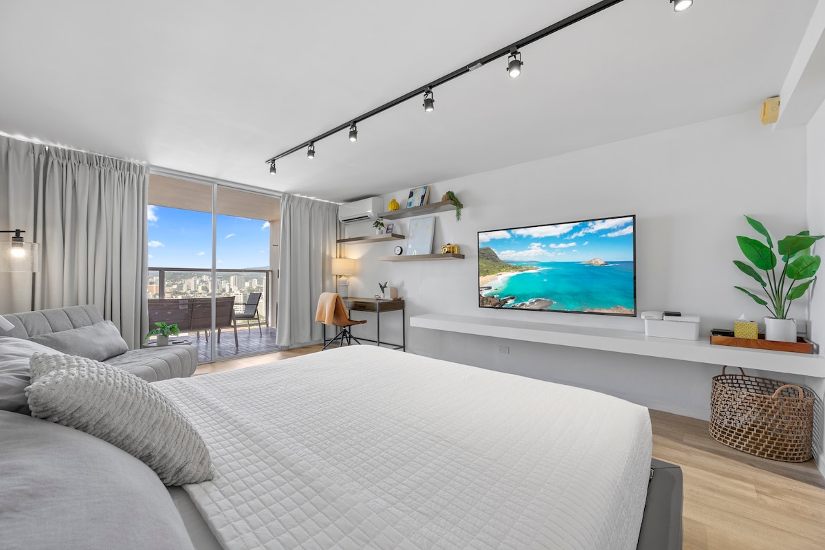 Nýuppgerð í apríl á þessu ári! Allt er GLÆNÝTT! Ótrúlegt yfirgripsmikið sjávarútsýni! Staðsett á 33. hæð í Waikiki borg, í aðeins nokkurra mínútna göngufjarlægð frá hinni frægu Waikiki Kahanamoku Beach & Lagoon, Ala Moana Beach Park, Ala Moana Shopping Mall, mörgum veitingastöðum , kaffihúsum og börum. Allt er í göngufæri. ÓKEYPIS BÍLASTÆÐI eru í boði í bílageymslu með afmörkuðu bílastæði í bílageymslunni. Þú skemmtir þér vel á þessu glænýja heimili með queen-rúmi og sófa til að gista á!