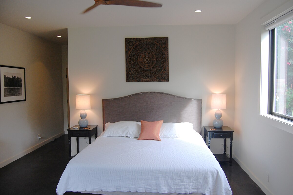 Falleg, friðsæl, frumskógarstemning, umkringd náttúrunni, 15 mín frá miðbæ Kona, uppi í fjallshlíðinni, gróskumikið mikið m/ ávöxtum og mac hnetutrjám! Eignin sem er aðeins fyrir FULLORÐNA er með opið gólfefni með mikilli lofthæð og miklu plássi. Lúxus memory foam King-rúm, tvö lanais að framan, gott Weber grill, stórt Samsung sjónvarp með kapalrásum, þráðlaust net, sameiginleg þvottavél og þurrkari og frábært eldhús með öllum þægindum. Einnig: strandhandklæði, stólar, kælir og regnhlíf! Þetta einkarými er stærsta eining heimilisins.