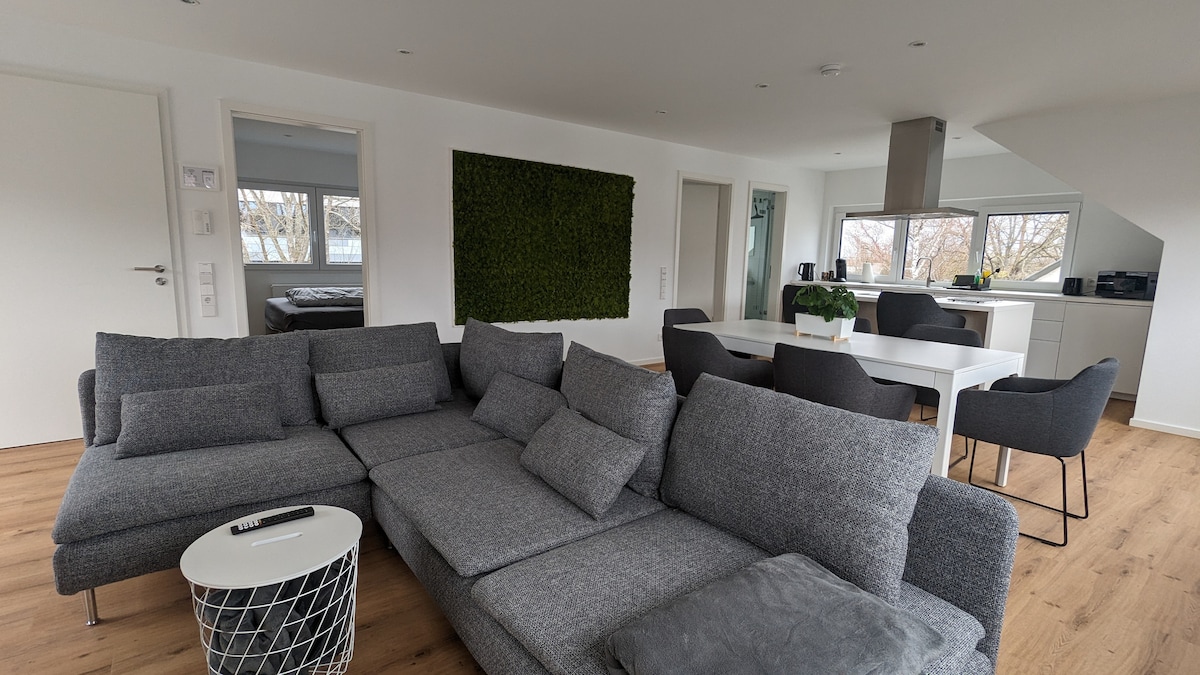 Gaman að fá þig í þessa fallegu þakíbúð sem þú getur gert í stuttu máli eða Langtímadvöl í næsta nágrenni við Stuttgart-flugvöllinn og viðskiptasýningin býður upp á allt: → 4 hjónarúm í king-stærð → 2 baðherbergi → Þrjú svefnherbergi fyrir allt að 8 gesti → Snjallsjónvarp 75 tommu og NETFLIX ásamt Amazon Prime → Bluetooth Cinema Sound System → Háhraðanet með I Pad Líkamsræktarbúnaður → og borðtennis → Nespresso-kaffi → Eldhúskrókur → Þvottavél/þurrkari → Bílastæði innifalið 2 mínútna → göngufjarlægð frá verslunarmiðstöðinni