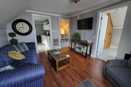 Notaleg og þægileg stúdíóíbúð í göngufæri frá vatnsbakkanum. Þetta rými á annarri hæð er með opið rými sem felur í sér eldhús, baðherbergi, borðstofuborð, rúm í queen-stærð og setusvæði. Svefnsófi í fullri stærð fyrir auka vini eða börn. Nóg af eldunartækjum. Leikir, bækur og efnisveitur sjónvarpsþjónusta á rigningardögum eða kvöldin í. Þessi vel útbúna íbúð er með útsýni yfir gróskumikinn, endingargóðan garð í rólegu íbúðahverfi. Gakktu að Aðalstræti á 10 mínútum.