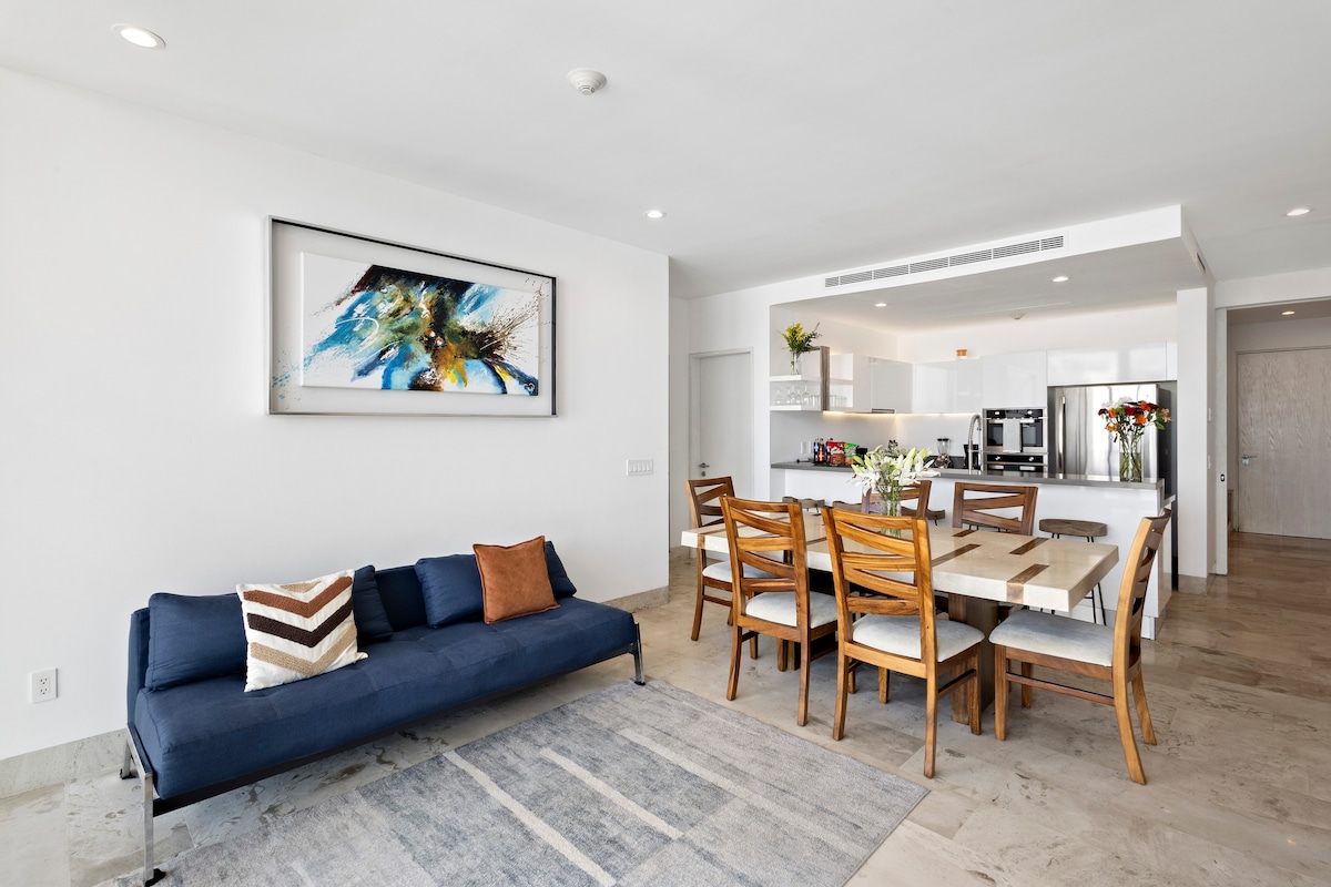 You will enjoy your stay in this spacious and modern condo, 881 sqft. It features a generous rooftop with stunning views of the city and the sea, a king-size bed, a large bathroom, a fully equipped kitchen, and an in-unit washer and dryer. During your vacation, you can swim in the crystal-clear waters of Playa Mamitas, which is just a 7-minute walk away. Additionally, you will find a wide variety of restaurants, bars, shops, and more on the famous 5th Avenue, located only a block away.