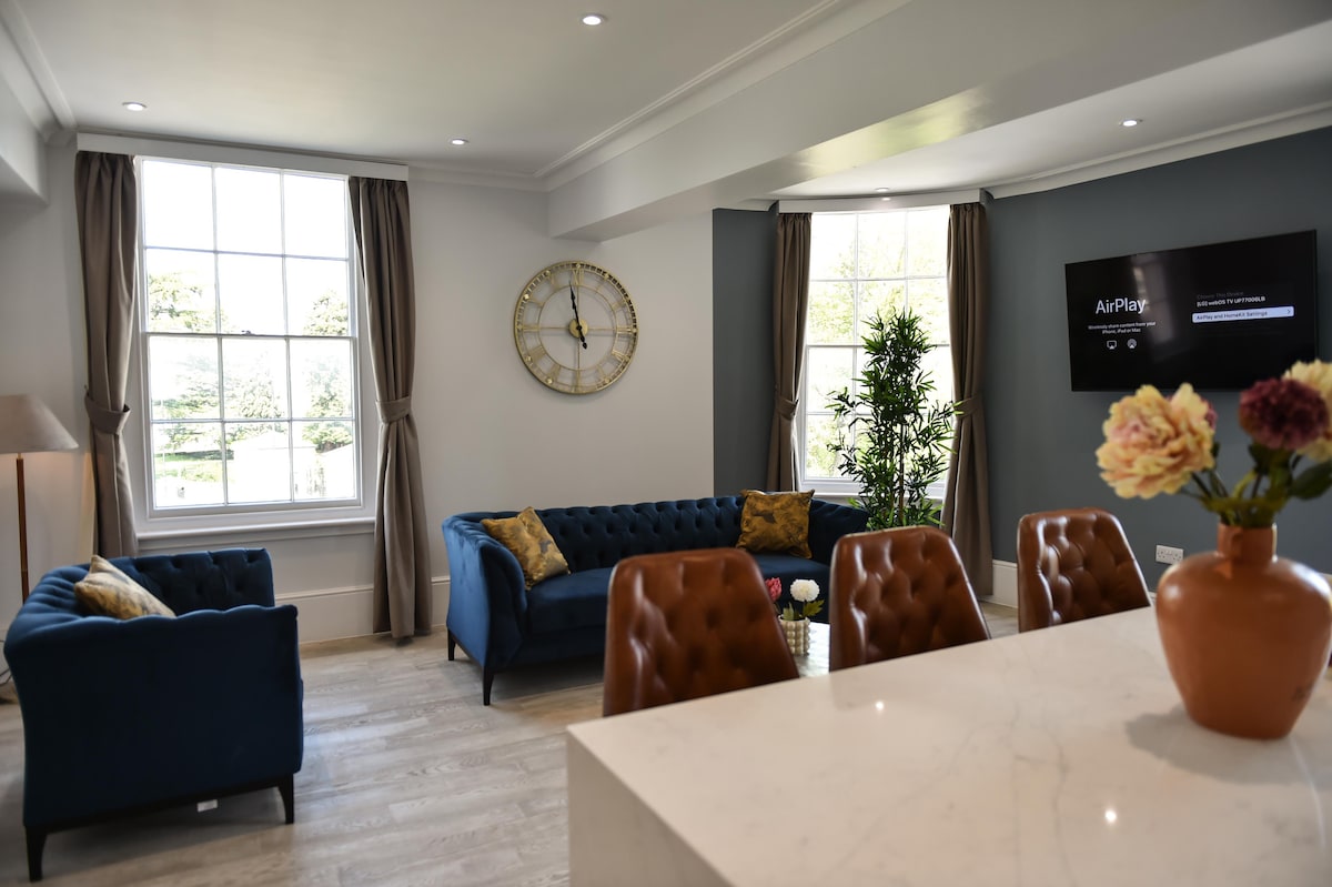 Staðsett í táknrænni, Grade II Skráð Victoria Colonnade, lúxus 1 svefnherbergi okkar, 1 baðherbergi Kingmaker íbúð í hjarta Royal Leamington Spa státar af víðáttumiklu eldhúsi/stofu og glæsilegu koparrúllubaði sem minnir á „Downton Abbey“. Það sameinar hefðbundna snertingu við hreina, nútímalega aðstöðu og yfirgripsmikið útsýni yfir sögufrægu Royal Pump Rooms, Jephson Gardens og ána Leam.