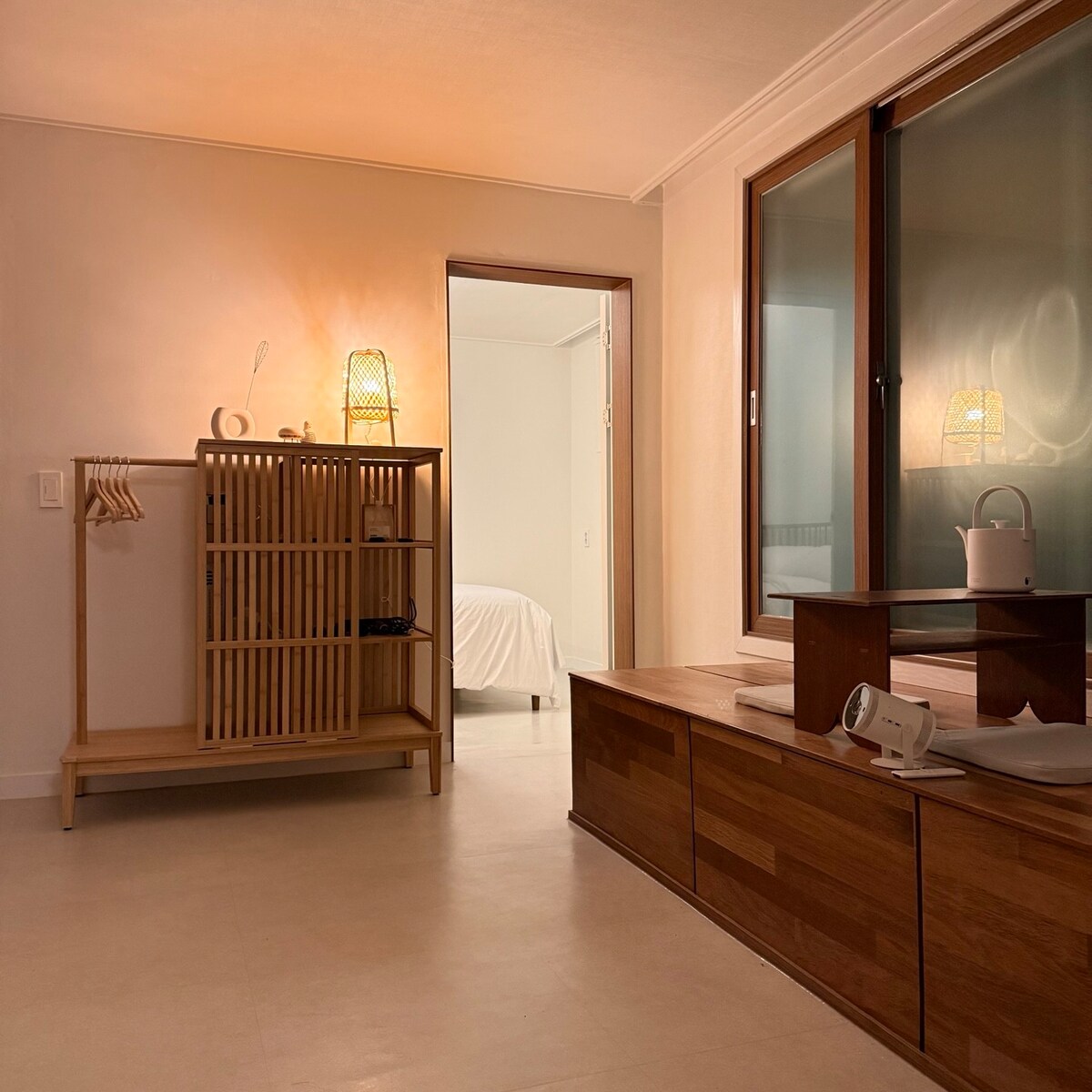 Andong Emotional Accommodation with the service and sensibility of a 5-star hotel Gistingin okkar, sem er bestuð í 5 mínútna akstursfjarlægð frá dæmigerðum áhugaverðum stöðum og mat eins og Wolyeong-brúnni, Imcheonggak og Galbi-sundi, býður upp á raunverulegan afgang af ferðinni fyrir utan einfalda „drekaflugu“. Tvö notaleg svefnherbergi (3 rúm), stofa og eldhús, snyrtilegt baðherbergi og tilfinningaleg verönd. Þetta er þægilegur staður fyrir allt að fimm manns. Ástæðan fyrir því að eignin okkar er svona sérstök er að okkur er annt um „ósýnilega staðinn“. Ég held að „hreinlæti“ sé mikilvægara en fína innréttingin. Við þrífum hvert horn vandlega og skiptum rúmfötum og handklæðum út fyrir ný í hvert sinn. Við sáum um 200 g handklæði í hótelflokki og meira að segja 35T dýnu fyrir djúpan svefn. Annað atriði! Ef þú vilt fara í lautarferð um Nakdong-ána erum við með ókeypis leigu á tilfinningaþrungna nestinu (mottum, borðum, luktum, vínglösum og risastórum spöðum). Bættu við gosbrunn tónlistarinnar við sólsetur og dagurinn endar eins og kvikmynd.