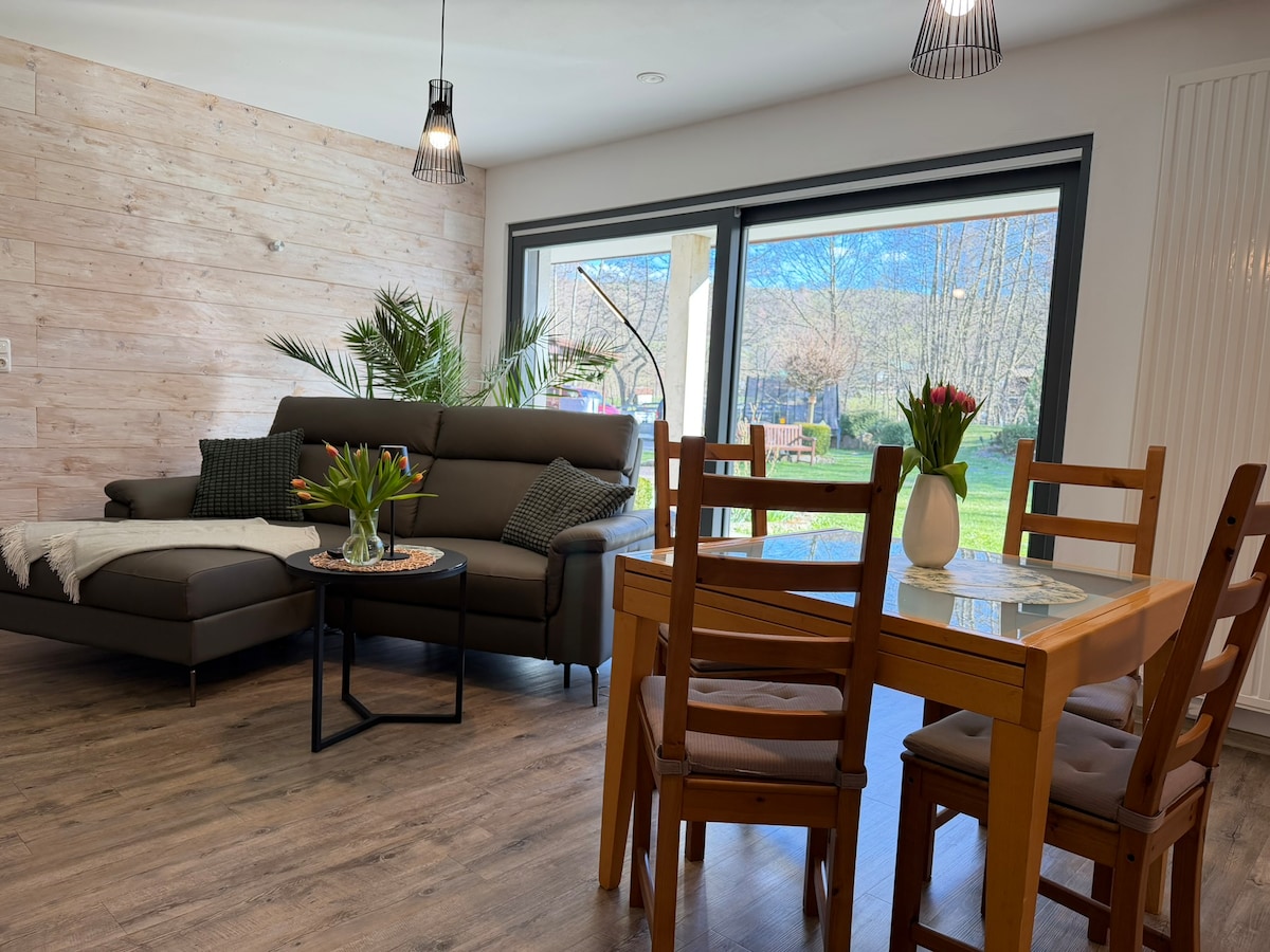 Þessi þægilega 108 fermetra íbúð á jarðhæð (aðgengileg) er á heillandi stað í sveitunum í útjaðri bæjarins, með greiðan aðgang að barokkborginni Fulda og nærliggjandi Rhön-svæðinu. Íbúðin er með tvö svefnherbergi og barnaherbergi ásamt tveimur baðherbergjum. Rúmgóða stofan er með 55 tommu snjallsjónvarpi, opnu borðstofusvæði og fullbúnu eldhúsi. Hún er örugglega til að vekja hrifningu. Notaleg stemning við viðarofn og baðker býður þér að slaka á og slaka á.