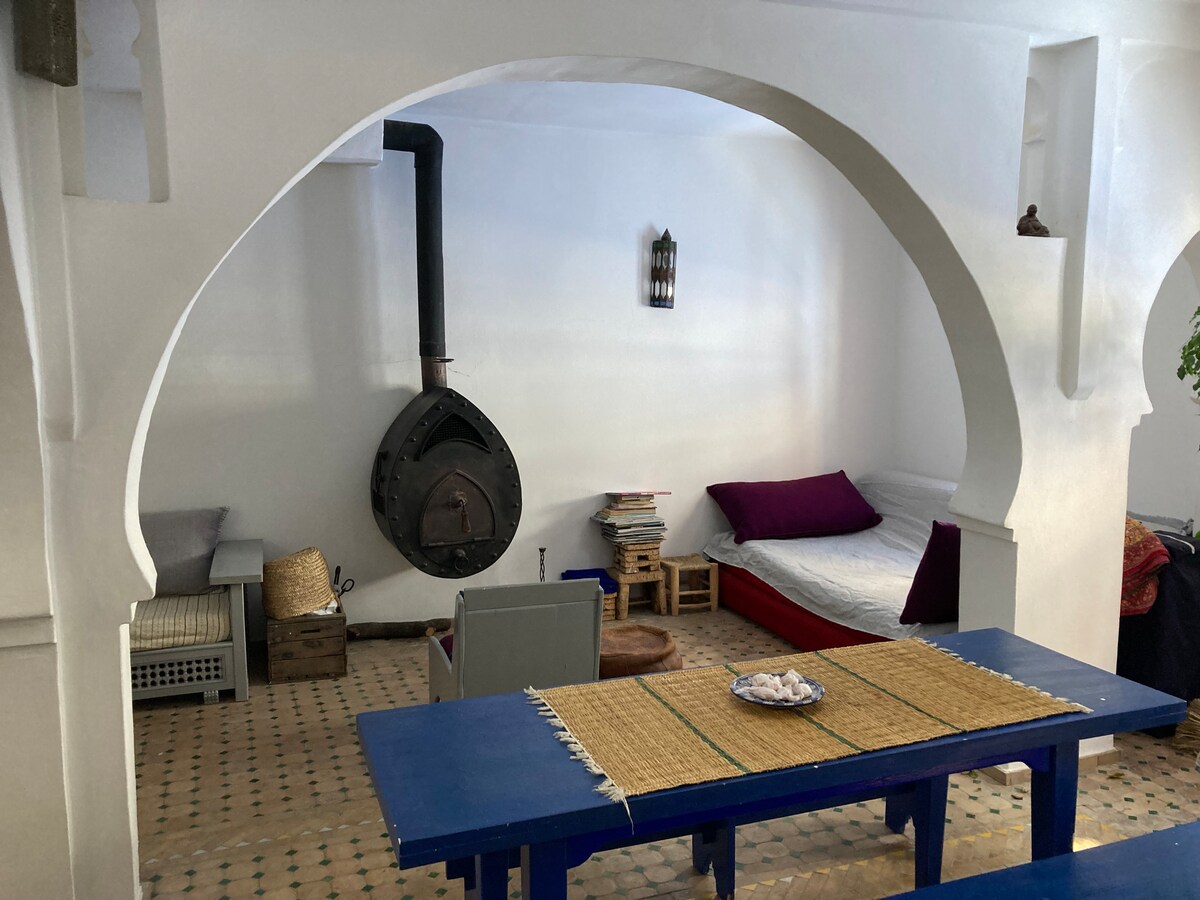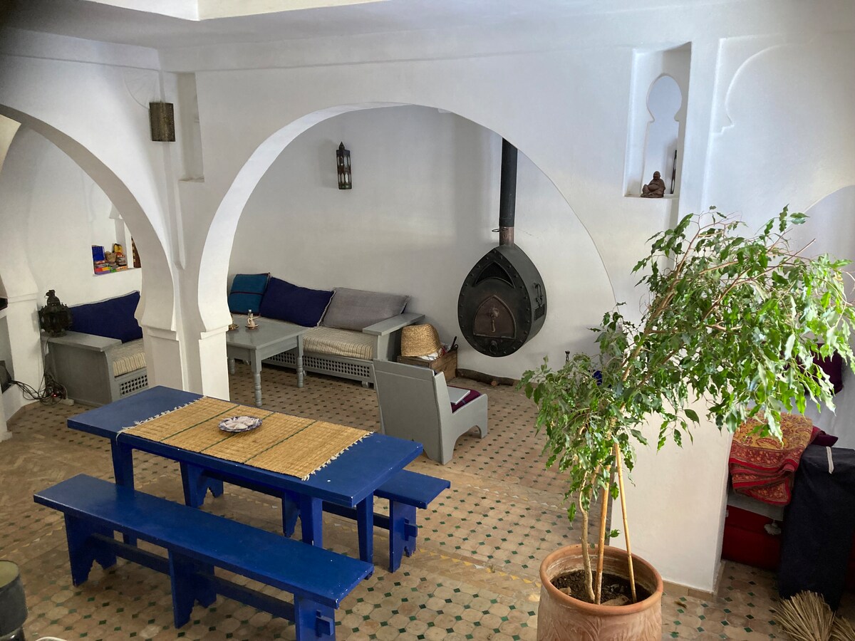 Hundrað ára gamalt Riad-hús við þekkta El Asri-götuna. Hún hefur verið enduruppgerð af handverksfólki á staðnum með handgerðum sedrusviðarvinnu, marokkóskum flísum og töfrandi, handgerðum loftlömpum. 2,5 svefnherbergi, 2,5 baðherbergi, loftræsting/hita í svefnherbergjum og borðstofu, þvottavél/þurrkari innifalin. Einkahúsþak með stórkostlegu útsýni. Hefðbundinn morgunverður innifalinn. Staðsett við friðsæla götu, fullkomið fyrir fjölskyldur sem leita að næði og ró. 5 mínútna göngufjarlægð frá aðaltorgi. Gestir segja að þeir vildi að þeir hefðu gist lengur en einn dag!