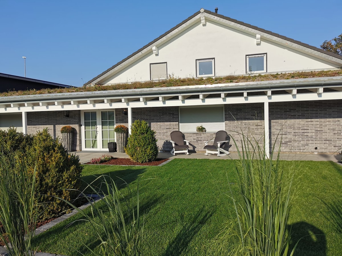 Þetta lítið íbúðarhús hentar fjölskyldum, ferðahópum og þeim sem vilja mikið pláss, ró, stóran garð og íbúðarhús. Frábær sem grunnur fyrir öll tilboð í Köln og fyrir Phantasialand í Brühl. Með 100 fm í 7 herbergjum fylgir 6 rúm í þremur svefnherbergjum, eitt hjónarúm, það er nóg pláss fyrir alla fjölskylduna. Einnig í boði: fullbúið eldhús, stór stofa með sjónvarpi og Wi-Fi, verönd, vistarvera og stór grasagarður.