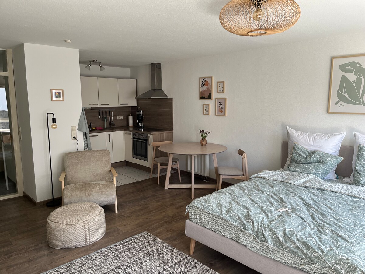 Íbúðin er staðsett í hálfri hæð í Esslingen með frábæru útsýni yfir borgina. Rólegur staður á leikvelli tryggir afslappað líf. Notalega stofan og borðstofan býður þér að sitja og rúmgóða svefnherbergið tryggir róandi slökun. Eldhúsið er nútímalegt og fullbúið og baðherbergið er bjart og nútímalegt. Tvær litlar verandir eru í boði og bjóða þér í sólsetrið í lok dags.