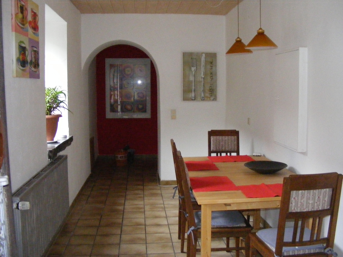 Nýuppgerð íbúð okkar tekur vel á móti þér. Í fallegu svæði umkringt opnum reitum og nálægt sögulegu miðju þorpsins er íbúðin okkar fullkominn staður til að byrja eða enda daginn. Ef þú hefur áhuga á gönguferðum er nýja gönguleiðin "Eifelsteig" aðeins 500 m frá íbúðinni. Strætisvagnastöðin til að komast í miðborg Aachener í aðeins 2 mín göngufjarlægð. Fjölskyldur með börn og/eða gæludýr eru einnig velkomnar. Ókeypis bílastæði fyrir 1 bíl og þráðlaust net er innifalið.