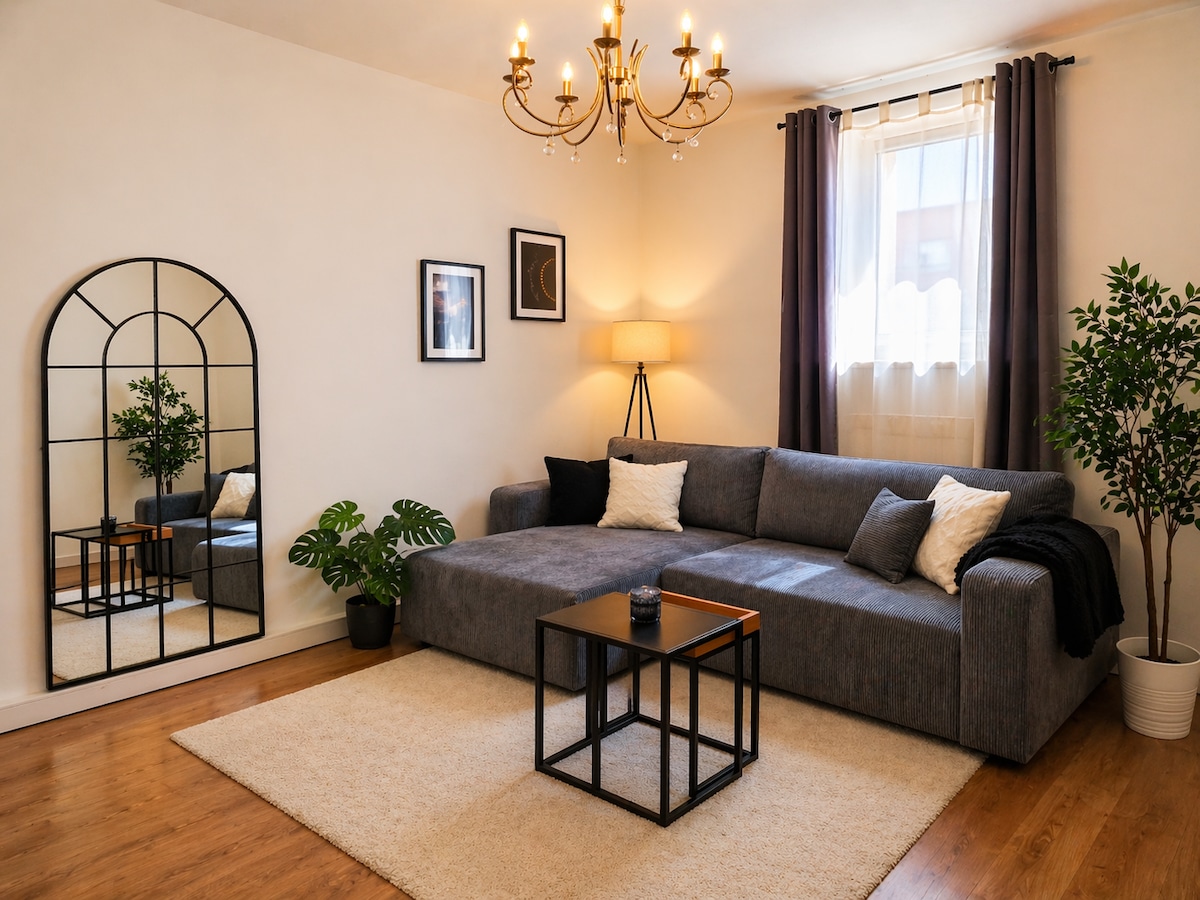 Verið velkomin á tímabundna heimilið þitt! Bjarta íbúðin býður upp á notalegt hjónarúm, aukasófa og nóg pláss til að slaka á. Stórir gluggar skapa vinalegt andrúmsloft en þráðlaust net og sjónvarp bjóða upp á afþreyingu. Við borðstofuborðið er bæði hægt að vinna og borða saman. Nútímalega baðherbergið með sturtu fullkomnar þægindin. Tilvalið fyrir afslappandi frí eða notalega viðskiptagistingu.