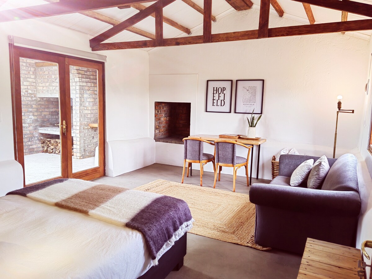 Enjoy the Westcoast countryside on a working Farm in Hopefield. This stylish farm cottage is situated in the heart of the Swartland and only 1 hour drive from Cape Town, 30 min drive from Langebaan Lagoon. Kick back and relax in this calm, stylish self-catering one bedroom space with its own bathroom and patio. Wake up to the tranquility of chirping birds in the morning. Take a nice walk in the fresh air while experiencing the beauty of this peaceful little country gem.