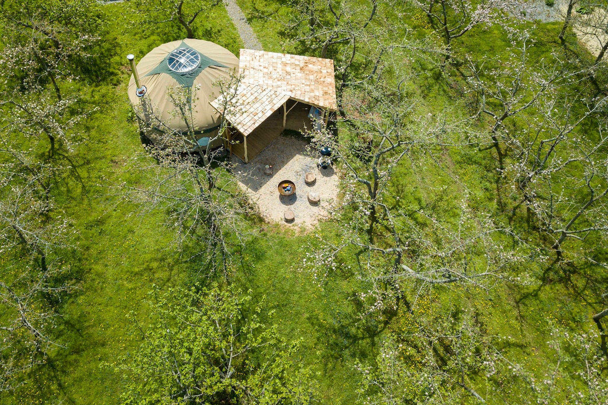 Fyrir fullkominn Somerset reynslu koma og vera í margverðlaunuðu Dabinett júrt okkar, staðsett innan trjánna af afskekktum 6 ½ hektara Orchard okkar, á jaðri hins fallega Exmoor-þjóðgarðs. Dabinett er með handgert, sérhannað rúm og er hitað með fallegum viðarbrennara með aðalrafmagninu. Úti er handgert yfirbyggt eldhús/matsölustaður og grill- og eldstæði sem gerir það að fullkomnu að komast í burtu, sama hvernig veðrið er!