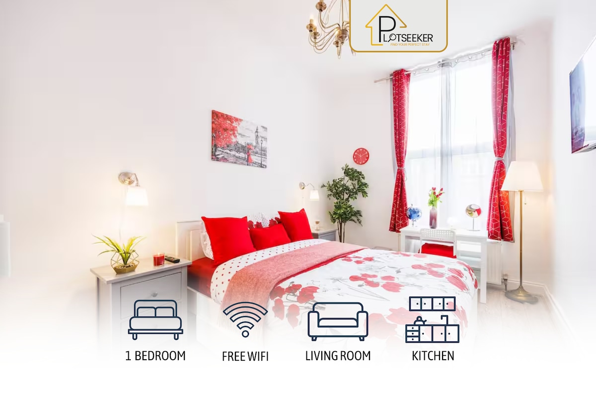 🌐 PlotSeeker stuttar leigur og þjónustugisting | London – Kensington 🌐 🗝 1 herbergis íbúð í Kensington 🗝 Rúmar allt að 5 gesti 🗝 Svefnherbergi – 1 × rúm af king-stærð 🗝 Stofa – 1 × einföld svefnsófi og 1 × tvöföld svefnsófi 🗝 Innifalið ofurhratt þráðlaust net 🗝 Greitt bílastæði við götuna í boði í nágrenninu 🗝 Auðvelt að komast að neðanjarðarlestarstöðvunum West Kensington og Barons Court 📩 Dvelur þú í viku eða lengur? Sendu okkur skilaboð til að fá sérstakan afslátt! 📩