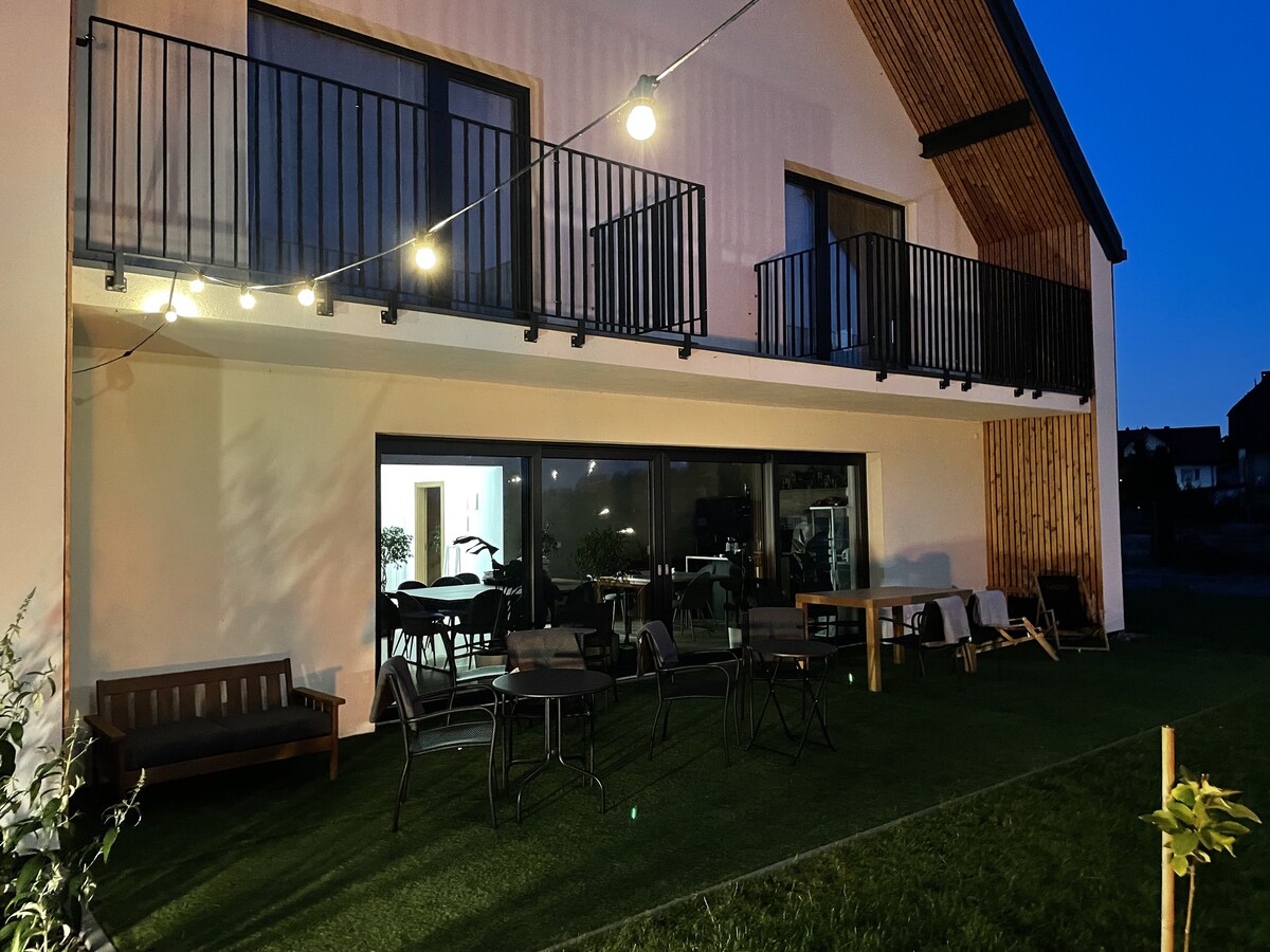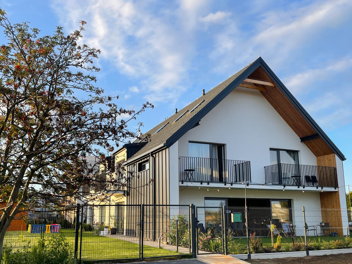 Rúmgóð og þægileg íbúð fyrir alla fjölskylduna. Tvö aðskilin svefnherbergi, eldhús(uppþvottavél, rúmgóður ísskápur, ofn). þægileg borðstofa fullbúin. Aukasvefnsófi. Verönd og aðgengi að garði. Rúmgott baðherbergi. Allt er sjálfstætt með sérinngangi til að viðhalda hámarks næði. 2x verönd og svalir. Þetta er tilvalinn staður fyrir stóra fjölskyldu. Bæði í stillingum 2+2 og 2+4. Innborgun gæti verið áskilin þegar fullorðnir bóka aðeins.
