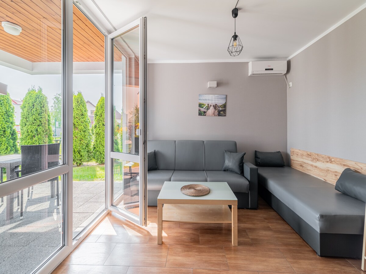 Heillandi 32m2 fullbúið húsbílar í aðeins 5 mínútna akstursfjarlægð frá Wicie ströndinni þar sem þú getur notið ýmiss konar fjölskylduafþreyingar á borð við yfirgripsmiklar hjólaferðir eða trjáklifur og aðeins í 15 mínútna fjarlægð frá vatnagarðinum Þú getur notið kyrrláts staðar og slakað fullkomlega á þökk sé frábærri verönd sem er 15 m2 að stærð Eignin er með 2 svefnherbergi, þar á meðal 3 rúm og samanbrjótanlegan sófa í stofunni sem rúmar 2 í viðbót