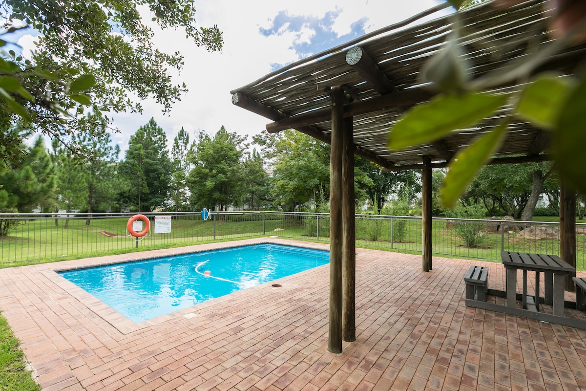 Secure world-class golf-estate down the road from an airport, lion park and paint-balling facilities. Our ground floor unit & surroundings offer: - UPS backed-up Wi-Fi - 24hr security - An 18 hole golf course - Pool, gym, tennis courts & a squash court - A clubhouse with a restaurant, bar, hall and sports shop Nearby amenities include: - 1 minute drive to Pick N Pay & Clicks (500m) - 5 minute drive to Blueberry Square (2km) - 8 minute drive to Northgate Mall (4km)