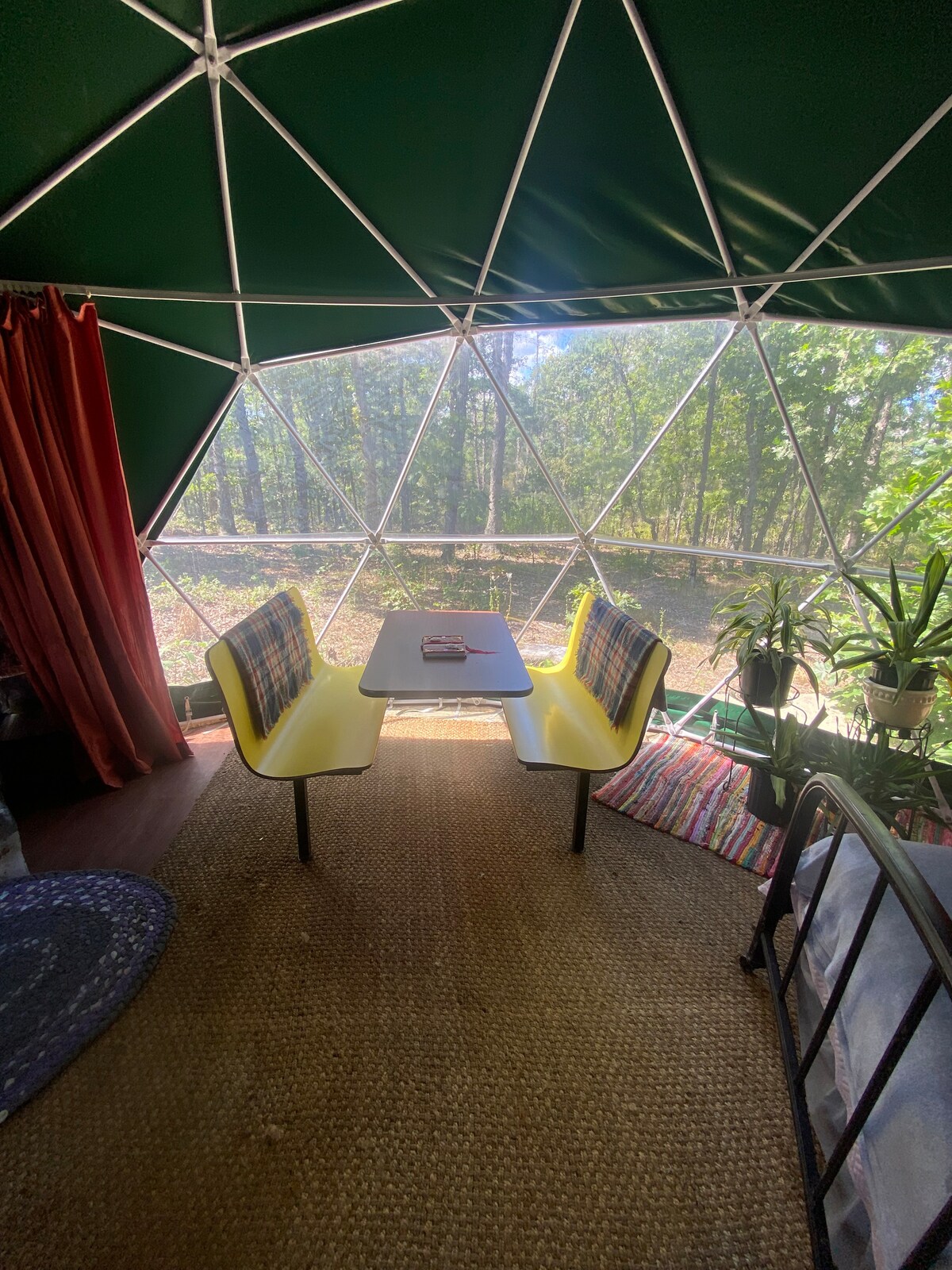 Experience serenity at Serenity Base, a cozy glamping dome where quiet mornings and starry nights blend with comfort. - Sleeps 2 | 1 bedroom | 1 king bed | 1 bath - Hot tub on deck – perfect for cool evenings & starlit soaking - Fire pit & private backyard for relaxing under the stars - Panoramic mountain views from dome and deck - Kitchen & bathroom essentials, WiFi, TV, heating & AC - Free parking & private entrance, steps to 37‑acre nature preserve
