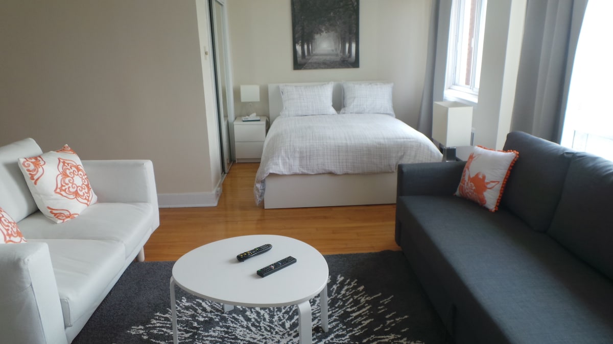 Fallegt stúdíó staðsett í hjarta Cote de Neiges nálægt fjallinu (Mount Royal). Frábært útsýni yfir háskólasvæði University of Montreal, það er 10 mín göngufjarlægð frá Cote des Neiges þorpinu með fullt af frábærum verslunum, einnig 10 mín göngufjarlægð frá Cote des Neiges neðanjarðarlestinni á bláu línunni og 7 mínútna rútuferð til Guy metro green line. Bus Stop 1 minute away located on a beautiful street. Parking outside but limited. Upphituð útilaug yfir sumarmánuðina(23. til 6. júní)
