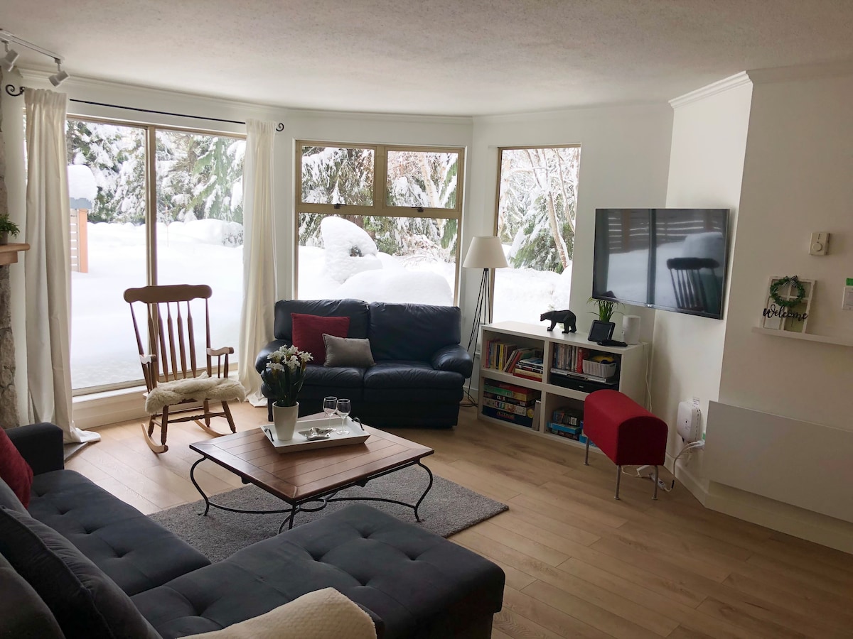Vetrarferð - Skíði, heilsulind og slökun í Whistler Notaleg íbúð á jarðhæð í aðeins 5 mínútna göngufæri frá Blackcomb-fjalli. Fullkomið fyrir gistingu á skíðatímabilinu. Njóttu þægilegs aðgangs að ræktarstöðinni, heita pottinum, gufubaðinu og skímageymslunni. 🔥 Slakaðu á við arineldinn eftir dag á brekkunum 🍳 Fullbúið eldhús 🧖♀️ Heilsulindir og vellíðunaraðstöður í nágrenninu 🚶♀️ Stutt göngufæri frá Fairmont og veitingastöðum á staðnum 🏔️ Tilvalið fyrir pör eða litlar fjölskyldur