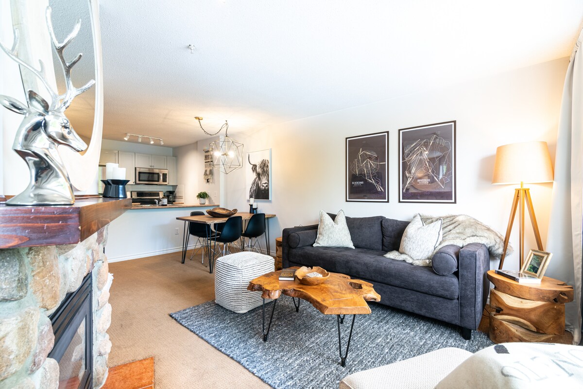 Verið velkomin í fjallavinina þína. Í 1 mín. göngufæri frá Blackcomb lyftunni! Nútímaleg íbúðin okkar er björt og rúmgóð með einu svefnherbergi og gluggum í kringum hana með fullkomnu útsýni yfir trjágróður og fjöll. Horfðu beint upp í Whistler-fjallið á meðan þú drekkur kaffi frá eldhúsborðinu! Svítan er með allt: - king-rúm - svefnsófi - Fullbúið eldhús, þar á meðal nýr uppþvottavél - soaker jet tub - Keurig - Bose hátalari - miðlægt loftræsting - uppfært í júlí 2025 Í byggingunni er ræktarstöð, þvottahús, sundlaug og heitur pottur utandyra.