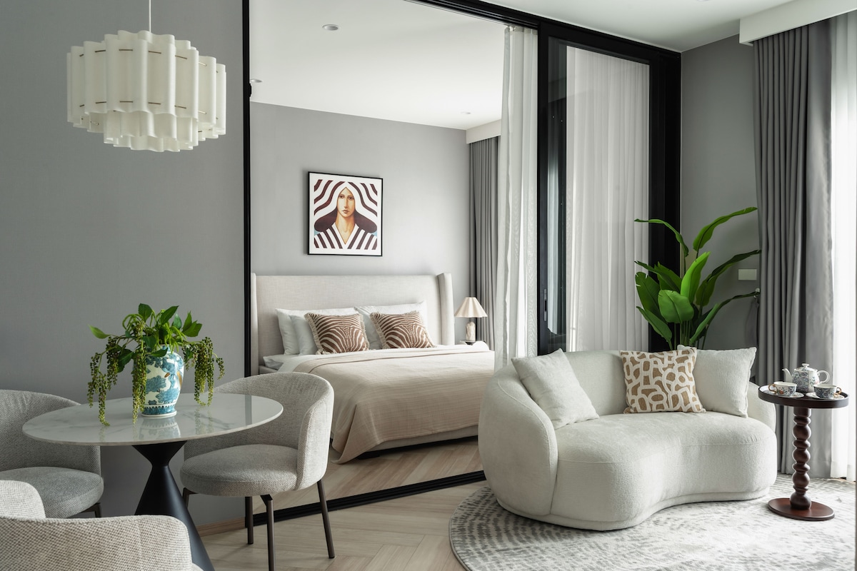 Tropical Oasis okkar er staðsett í líflegum hjarta borgarinnar og er með 2 svefnherbergjum, notalegri hönnun og rúmgóðu stofusvæði. Það er í stuttri göngufjarlægð frá vinsæla helgarmarkaðnum þar sem þú getur sökkvað þér í menninguna á staðnum, smakkað götumat og notið útivistar. Stór almenningsgarður er í aðeins 1,5 km göngufjarlægð. The Central Foresta luxury shopping mall, a hub of entertainment, dining, and shopping, is conveniently located within 1,5 km from our apartment. 10 min drive to Historic Phuket Old Town.