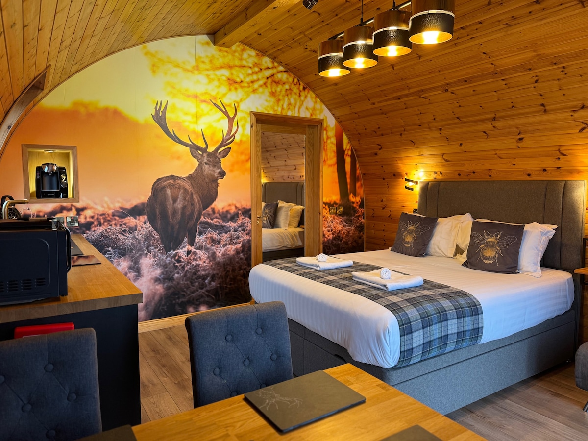 Nýbyggður, aðskilinn, umhverfisskáli, fullfrágenginn í háum gæðaflokki með king-size svefnherbergi og lúxus en-suite sem er bæði með frístandandi baði og sturtuklefa. Stofa samanstendur af nútímalegu eldhúsi, nútímalegri borðstofu með sætum fyrir 4 og setustofu með tvöföldum svefnsófa og snjallsjónvarpi. Rúmgóða stofan er með fallegu hvelfdu lofti, gleri í fullri hæð og frönskum hurðum sem liggja að fullkomlega lokuðum bakgarði og verönd með 6 sæta lúxus heitum potti. Fullkomið aðgengi.