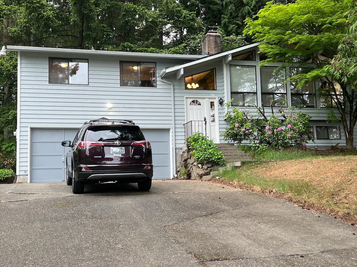 SÓTTHREINSAÐ FYRIR ALLA GESTI...þar á meðal nýþvegin rúmföt. Því miður, engin PARTÍ. Njóttu afslappandi dvalar við vatnið í rólegu skógarumhverfi. Aðeins nokkrar mínútur frá verslunum, mat, skemmtun og ströndum. Miðsvæðis milli Tacoma og Seattle, um 20 mínútur frá SeaTac flugvellinum - nálægt I-5/WA-18 intx. Sund, kanó, kajak, fiskur (WA leyfi krafist), ganga í gegnum skóginn eða bara slaka á við eldgryfjuna og horfa á dýralífið. Ókeypis bílastæði! Auka USD 25 ræstingagjald á gæludýr - samkvæmt húsreglum.