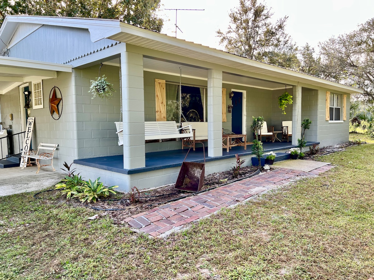 Stay in a charming pet friendly 1920s historic home in Dade City featuring a fully fenced yard, front porch swing, and firepit.— thoughtfully updated with modern comfort. Highlights: • 2 bedrooms: 1 king bed, 1 queen bed + air mattress • Front porch swing — perfect for morning coffee or evening relaxation • Deck with grill for outdoor dining • Firepit with chairs for cozy nights • Cornhole game for added fun • Just 10 minutes from downtown Dade City • 15 minutes from Saint Leo University