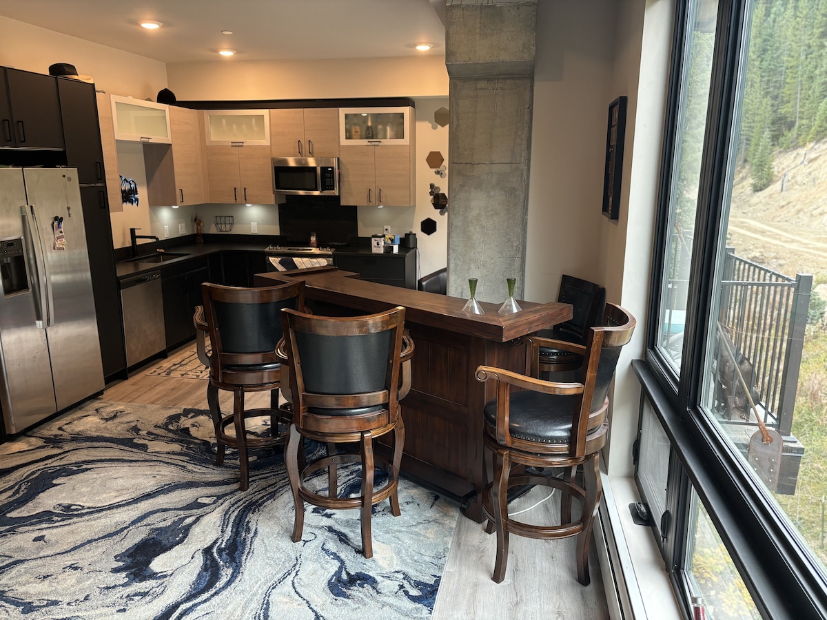 Tveggja svefnherbergja, tveggja baðherbergja íbúð á efstu hæð með þremur einkasvölum. Fullbúið eldhúsið okkar er fullbúið með öllum þægindum sem þú þarft til að útbúa uppáhaldsmáltíðirnar þínar og við bjóðum upp á snyrtivörur þér að kostnaðarlausu. 15 mínútna göngufjarlægð frá börum og veitingastöðum við aðalgötuna og á ókeypis skíðaskutlunni að fjallinu eða Main Street. Nýttu þér ókeypis bílastæðin okkar fyrir framan bygginguna og slappaðu af eftir langan dag í brekkunum eða stígunum í heita pottinum utandyra.