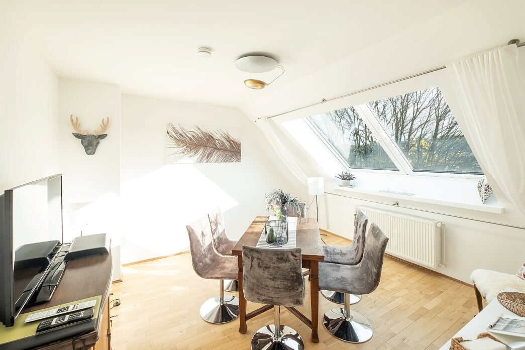 Sérstakur staður í risi. Stöðugri umbreytt með mikilli ást á smáatriðum með hjónarúmi og svefnsófa fyrir 3 -4 manns/pör. Rúmgott baðherbergi með baði./sturta. Opið rými með eldhúsi fyrir sjálfsafgreiðslu. Einkaútisvæði með borði og garðsófa. Þrátt fyrir sameiginlega eign með sögulegu húsi með fullkomnu sjálfstæði og næði. Fyrir náttúruunnendur er fullkomið afdrep við skógarjaðarinn. 8 mínútur að Baldeney-vatni. Almenningssamgöngur (5 mín til strætó/14min S-Bahn)