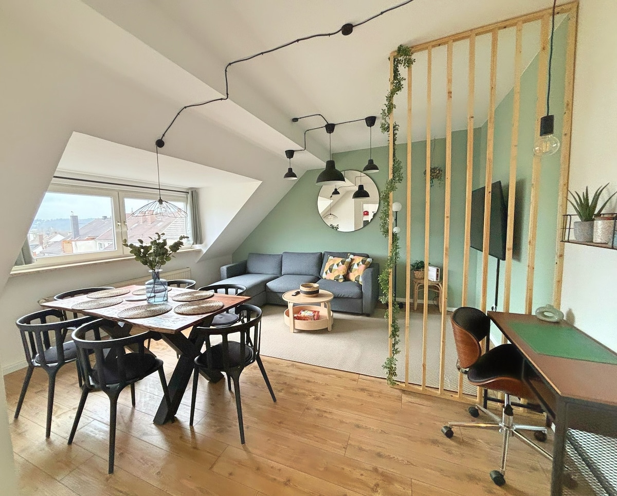 Experience urban comfort in the heart of Witten! This stylish 85 m² loft features two bedrooms with luxurious box-spring beds, a spacious living area with a pull-out mattress sofa, a fully equipped kitchen, and a modern bathroom. Relax on the cozy couch, enjoy entertainment on the Smart TVs, or savor a fresh coffee from the fully automatic machine. The central location offers easy access to the pedestrian zone and a supermarket next door. Plus: a reserved private parking space in the backyard. P