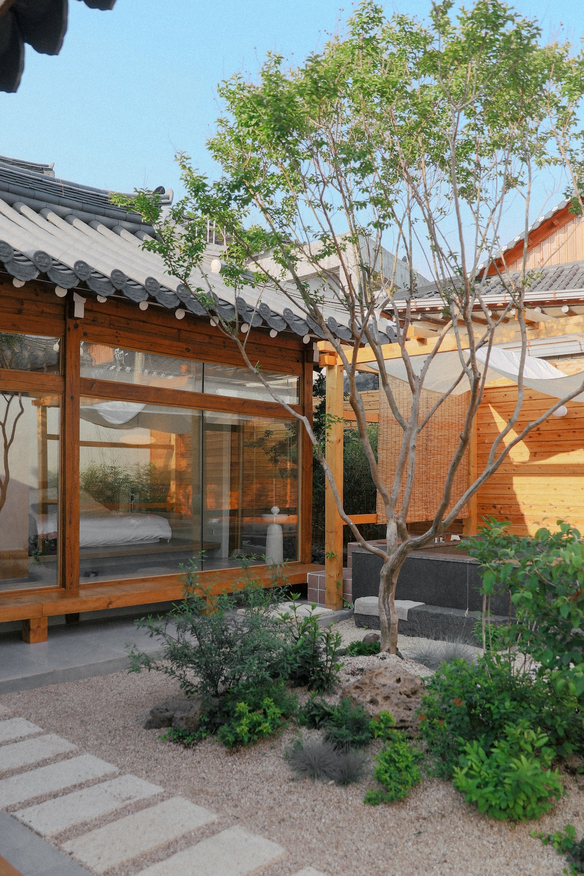 ✨[5min to Hwangridan-gil] Private Hanok Stay w/ Jacuzzi Stay at “Gruzam,” a modern yet traditional Hanok house in the heart of Gyeongju. Just 5 mins from Hwangridan-gil & Daereungwon & Chumsungdae 🏡 Private house for up to 6 guests | 2BR·2BA, king beds ♨️ Jacuzzi, 📶 Wi-Fi, 📺 Smart TVs (60”/75”) 🚗 Free parking, 🚭 Non-smoking indoors 💨 Dyson Airwraps, 🧴 full amenities, 🍪 snacks & morning dessert Perfect for families, couples, or friends!
