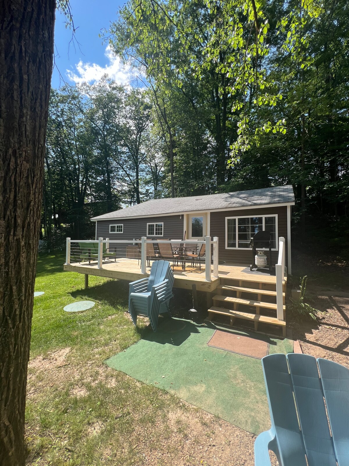 Lítil en notaleg íbúð eins og umhverfið. Nútímalegar uppfærslur veita þér þá tilfinningu utandyra sem Northern WI veitir, sem og þá nútímalegu stemningu sem margir kunna að meta. Í stofunni er þægilegur sófi til að slaka á og útsýni yfir stöðuvatn. Pallur í fullri stærð til að slaka á. Í einu svefnherbergi færðu hefðbundið rúm/kommóðu til að sofa vel. Í öðru svefnherberginu er rennirúm (2 einbreið rúm) en það er einnig notað sem skrifstofurými þar sem þú getur sinnt vinnunni án þess að fara út af heimilinu.