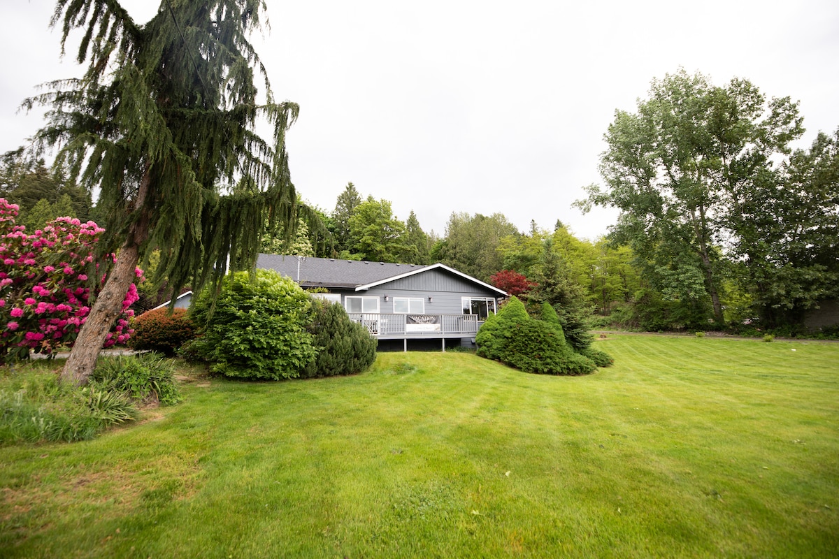 Þetta heimili með einu svefnherbergi og fullbúnu heimili er á fimm hektara landareign við innkeyrsluna frá aðalaðsetri gestgjafans. Áður fyrr var heimilið notað af tengdafólki mínu. Staðsetningin er mjög róleg með gönguleið á staðnum í gegnum tignarleg sígræn tré. Við erum í innan við 1,6 km fjarlægð frá verslunar- og mataraðstöðu. Við erum í innan við hálftíma akstursfjarlægð frá Seattle og Everett, Washington.