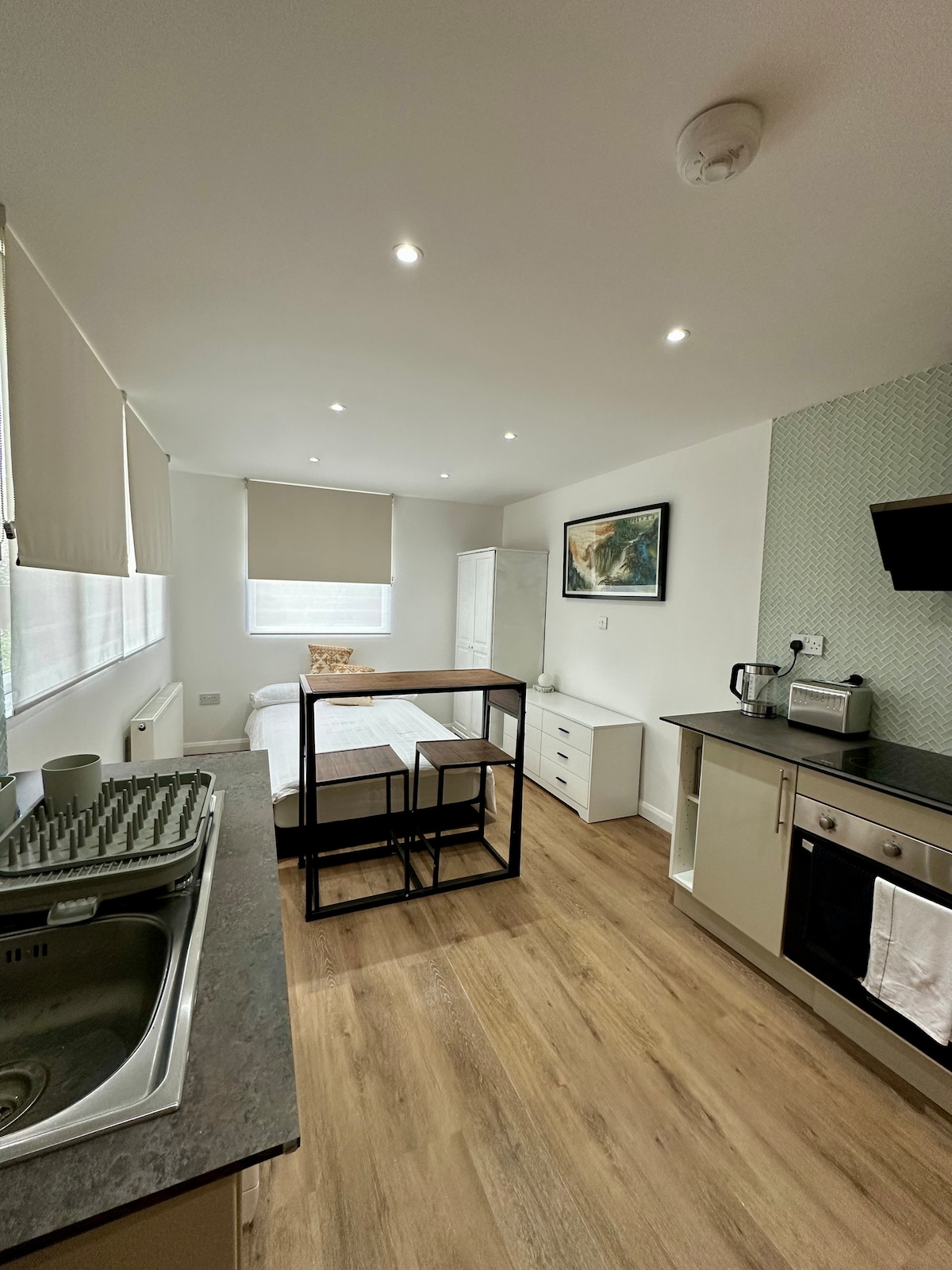 Slappaðu af í þessu stílhreina garðstúdíói sem er hannað fyrir byggingarlist og er aftast í kyrrlátum garði. Þetta nútímalega rými býður upp á allt sem þú þarft fyrir afslappaða og þægilega dvöl með sérinngangi frá hliðinni og sérstöku bílastæði. Worcester Park lestarstöðin - 8 mínútna ganga (svæði 4; lestir til London Waterloo: 29 mín) SL7 rúta til Heathrow-flugvallar Waitrose supermarket, restaurants/bars, Central Road shops - 5 mínútna ganga Frábærir almenningsgarðar og opin svæði í göngufæri.
