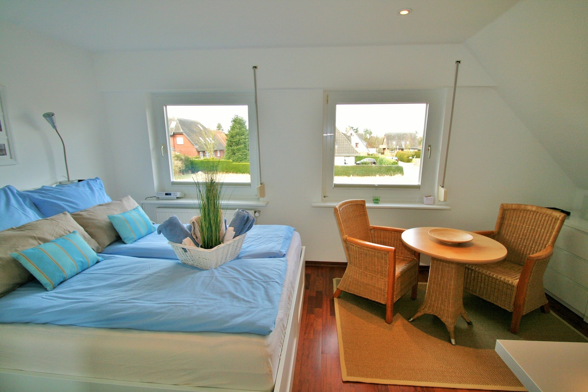 Þú gistir á miðri fallegu eyjunni Föhr í þorpinu Midlum. Loftíbúðin, eins og gestasvæðið á efri hæðinni í frábæra þakhúsinu mínu, tekur vel á móti þér. Þú ert með eigið eldhús og baðherbergi. Þú sefur í 140x200 stóru rúmi. Í boði er eldhússófi sem rúm (80x200 m) fyrir þriðja gestinn. Þú getur haft það notalegt á sófanum fyrir framan sjónvarpið. Greiða þarf borgarskattinn sérstaklega hjá mér í reiðufé.