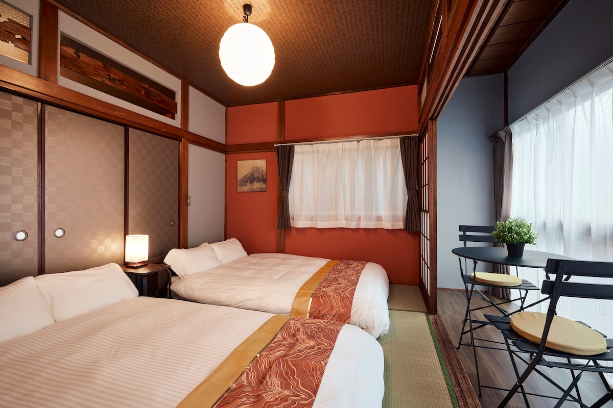 【110㎡ heildaraðstaða frá 1. hæð til 3. hæðar frátekin】 Það er mjög fallegt og hreint og þú getur notað alla rúmgóðu aðstöðuna til einkanota. Henni verður ekki deilt með öðrum hópum. 【4 svefnherbergi/hámarksfjöldi gesta er 16 manns】 Það eru 4 svefnherbergi. Í hverju svefnherbergi er hjónarúm eða einbreitt rúm svo að þú getur haft þitt eigið einkarými. Hámarksfjöldi gesta er auk þess 16 manns og hentar því vel fyrir stórar hópferðir eða ferðir með mörgum fjölskyldum.