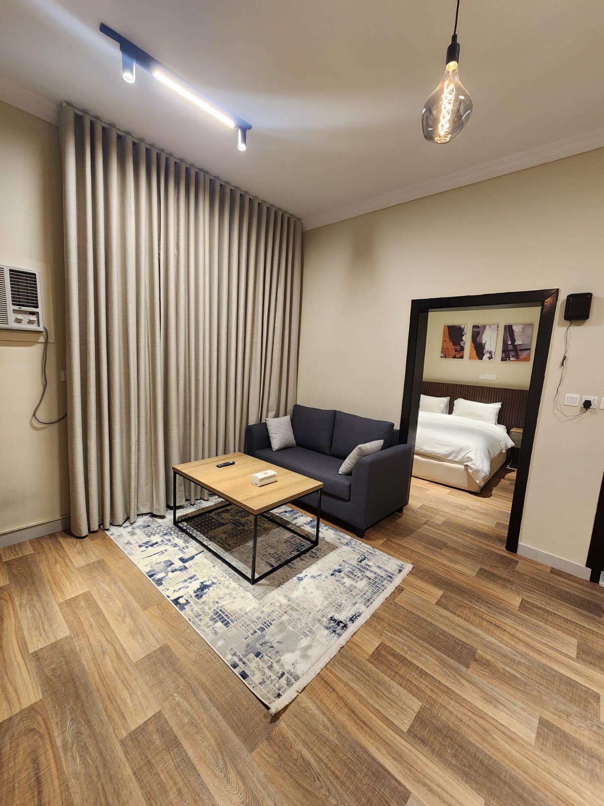 Glæsileg íbúð með svefnherbergi, setustofu og eldhúsi með hornkistu sem verður að rúmi og einkennandi innréttingum með hljóðlátri staðsetningu og bílastæði með fallhlíf í Yanbu Industrial City. Laust : Kæliskápur Kanb-horn, sófaborð og stórt 55 sjónvarp Rúm af queen-stærð