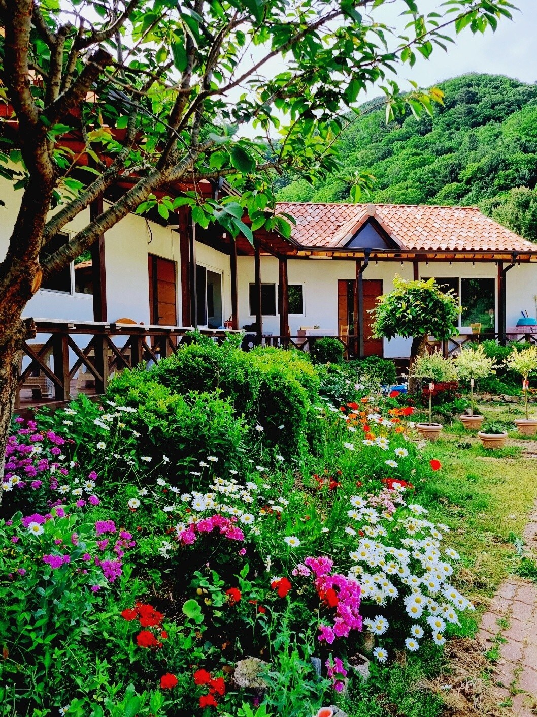 Þetta er einkabygging í Geumbyeongsan-hæð fyrir aftan Kim Yu-jeong Munhak-þorpið þar sem eitt teymi getur notið garðsins og gistiaðstöðunnar á dag til fulls. Við bjóðum upp á 100% bómullarlín og soðin handklæði fyllt af sólarljósi í hvert sinn sem þú þværð. Þetta er björt gistiaðstaða með góðu sólarljósi í gegnum stóran glugga. Þetta er stúdíótegund með tveimur einbreiðum rúmum hlið við hlið svo að hún er einföld fyrir 2 fullorðna og hægt er að útvega aukarúmföt fyrir allt að 4 manns og allt að 4 manns geta farið inn, þar á meðal ungbörn. Það er ókeypis allt að 2 ára (allt að 24 mánaða) og það eru engin aukarúmföt í boði ef þau eru ókeypis. Þú getur séð Samaksan-fjall og ef veðrið er gott geturðu séð fallegt sólsetrið, fullt af rauðu ljósi. Við bjóðum upp á morgunverð gegn gjaldi. (5.000 won/person, 3.000 won under elementary school/person, dunch for consecutive nights, etc.) Ef þú vilt skaltu panta fyrirfram. Við veitum ekki grillþjónustu. Gistingin okkar er ekki með eldhúsi svo þú getur ekki eldað. Þú getur notað örbylgjuofninn og kaffikönnuna.