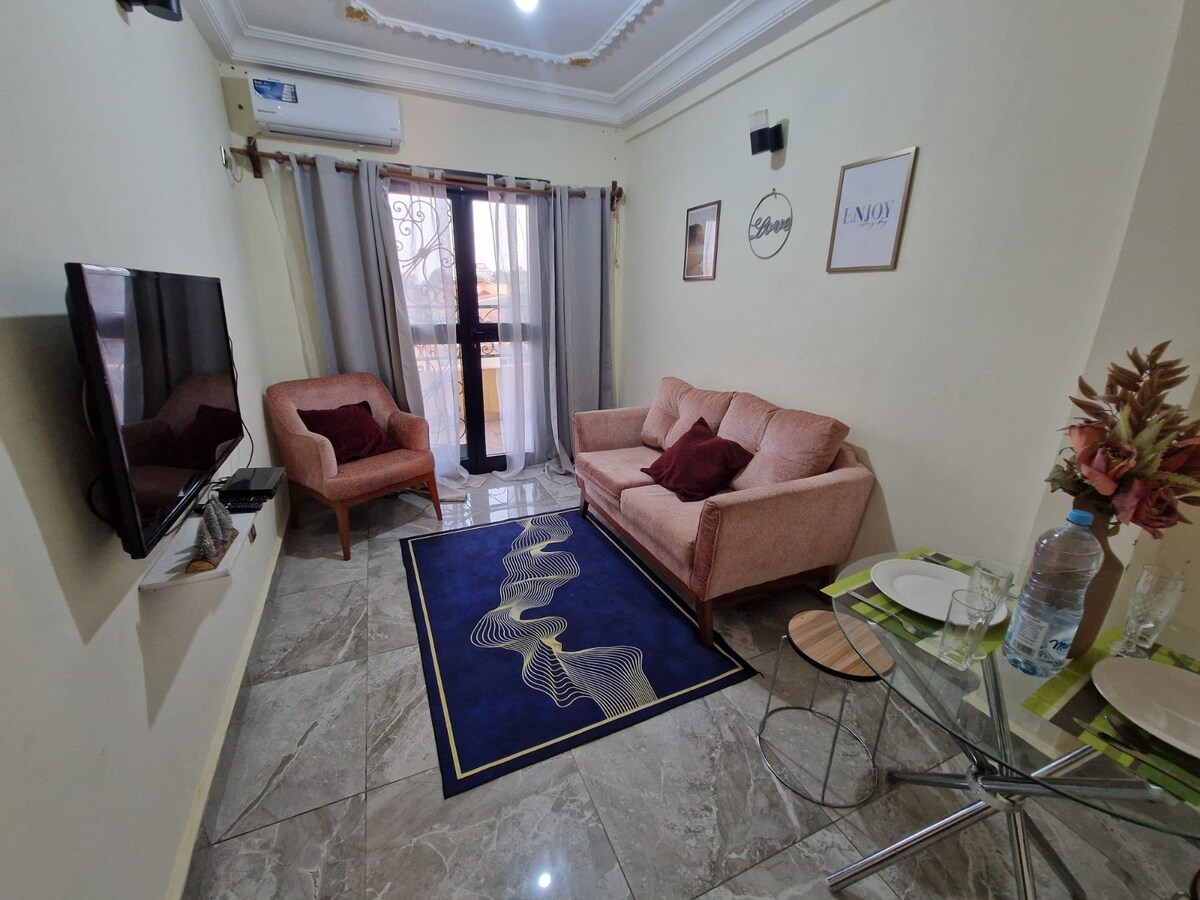 This apartment located in a heart of one of a high standing city in Yaounde, here you will find all commodities around and easy to access . This fully furnished apartment has a big parking with cameras.