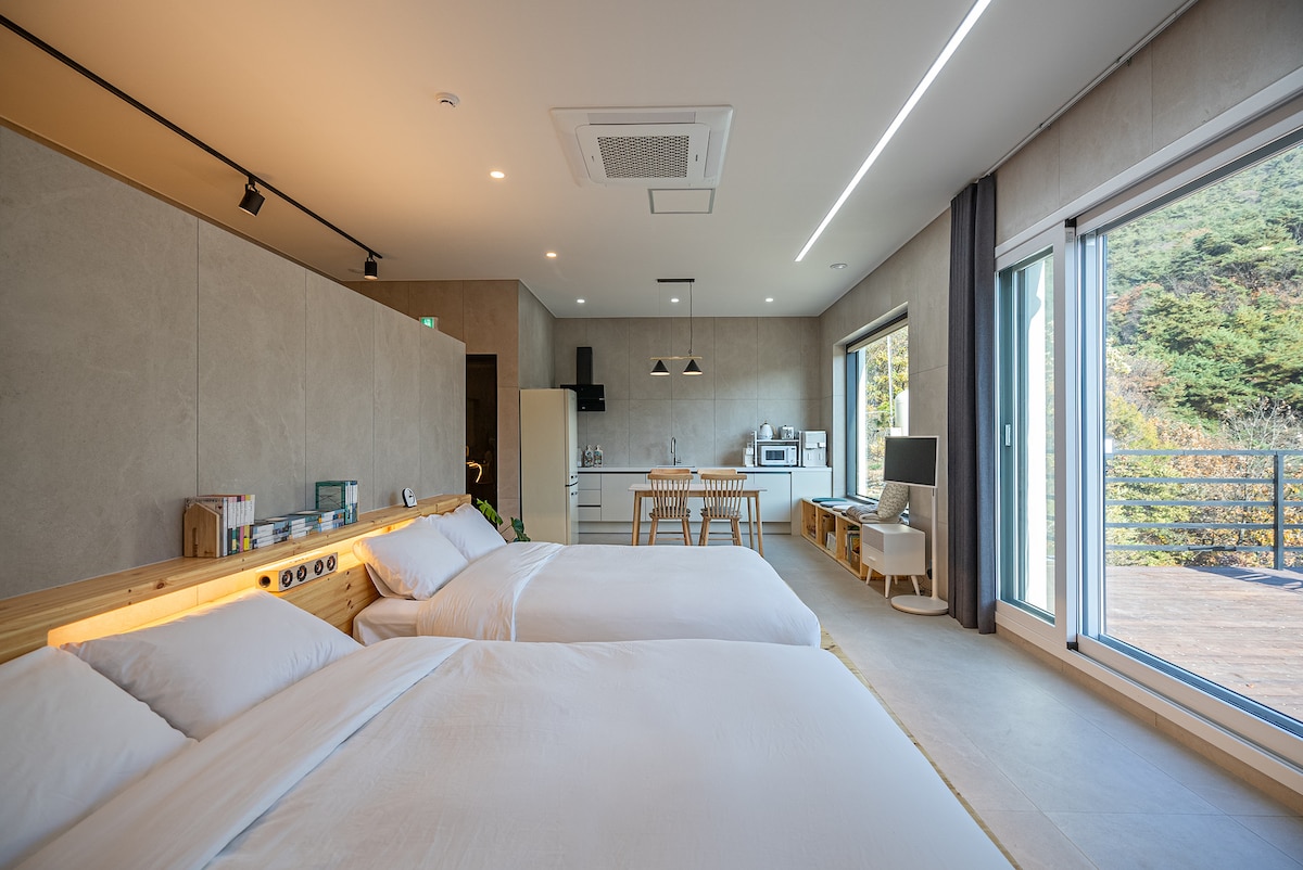 Þetta er hlýjasti mánuður ársins. Hlýlegt rými fyrir aðeins eitt teymi. Eigðu góðar minningar:) ※ Leiðbeiningar um notkun - 20.000 KRW afsláttur á nótt í 2 nætur eða lengur - Bílastæði í boði við húsasund í nágrenninu - Útiaðstaða með eldunaraðstöðu (rafmagnsgrill) - Þak á þaki utandyra (útilegustóll, lukt, nestissett) -Marshall Bluetooth hátalari -Sjálfsbar fylgir (beygla, bláberjasulta, rjómaostur, hrísgrjónanúðlur, Andong Sikhye, hylkjakaffi, O'Sherlock te) - Einstaklingsþægindi, bleikt saltbaðefni frá Himalaja (nema tannbursti og tannkrem) - Beam skjávarpa (YouTube, Netflix, Wired)/wifi - Spila og ýmis leiktæki - Teett (blómate) ※ Bókun og verðleiðbeiningar Virkir dagar (Sun ~ Fim) 230.000 vann fyrir 2 manns Helgin (fös ~ lau/frídagar) KRW 280.000 fyrir 2 manns * Fyrir allt að 4 manns/1 einstakling til viðbótar, aðeins +2