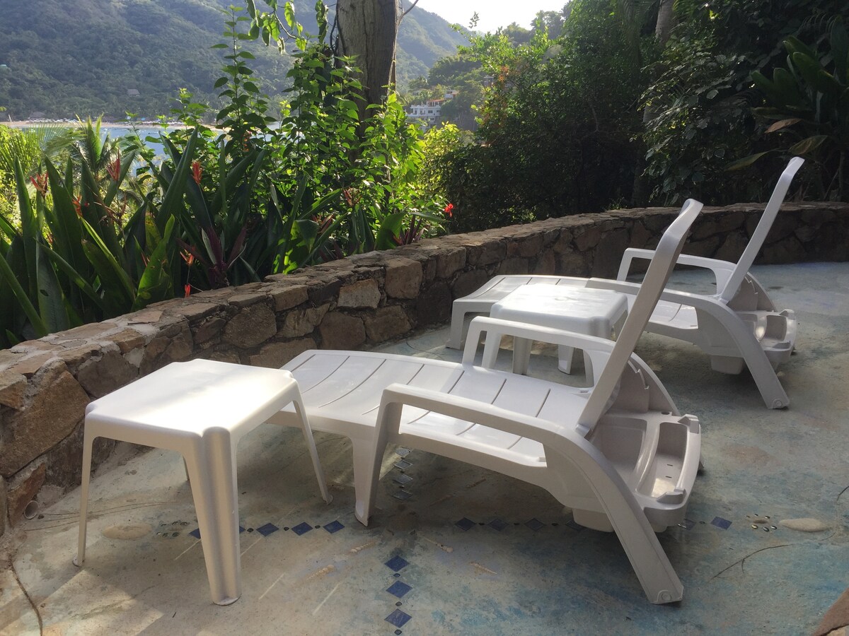 This beautiful apartment is centrally locatedin downtown. You can enjoy the best views of town and overlooking the water in Yelapa with air conditioned. The location is close to the restaurants, grocery stores, 7 minutes from the waterfall, beach inmediately below. The main space of the open floor plan over looks the bay of Yelapa, where you can relax in the hammocke and enjoy the breeze of the ocean. The kitchen comes with a refrigerator, gas range, microwave, coffee maker and cookware.
